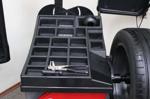 Станок оснащен педалью фиксации колеса, что упрощает процесс установки грузика;