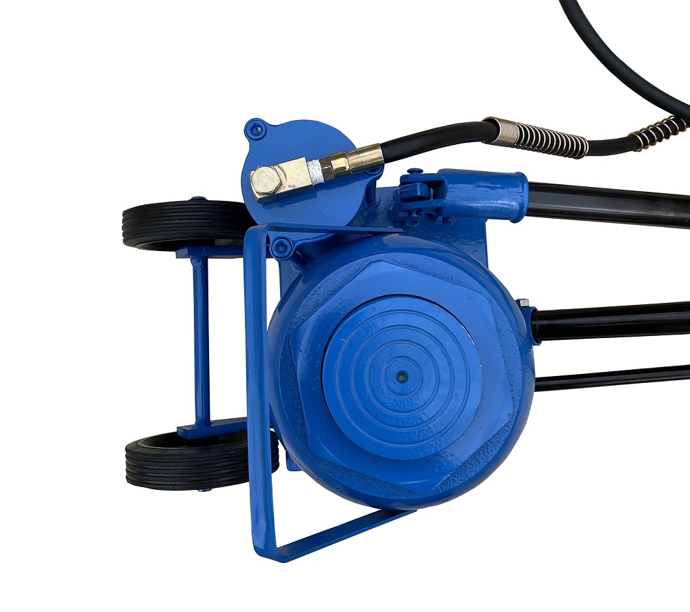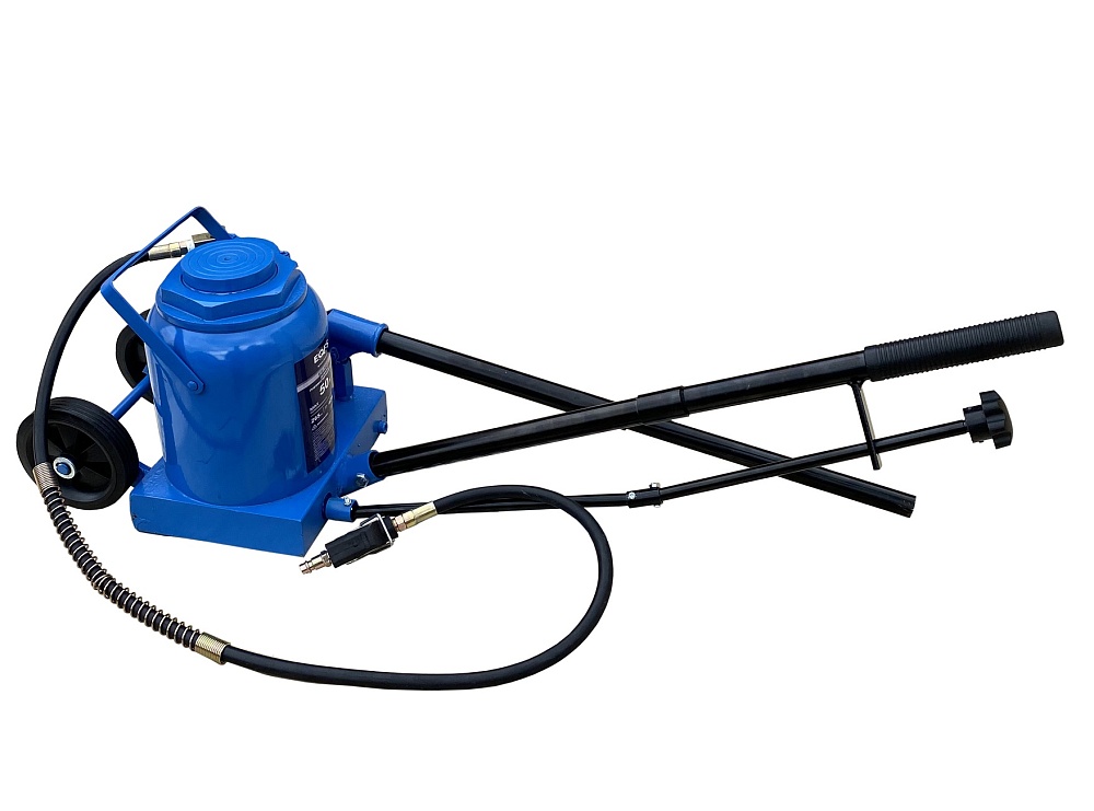 Пневмогидравлический. г/п 50т. Подхват под раму и мосты грузовых автомобилей и спецтехники. Увеличенный диаметр металлических колес домкрата, позволяет легко транспортировать его по не ровным поверхностям.  Можно поднимать автомобили для ремонта ВМЕСТЕ С ГРУЗОМ. Высота подъема 265-425мм. Ход поршня 160 мм.<br /><br />Технические особенности (Грузовой подкатной пневмогидравлический домкрат 50 тонн):<br />Домкрат рекомендуется к применению в шиномонтажных мастерских, автосервисах и авторемонтных предприятиях.<br />Диаметр металлических колес домкрата, позволяет легко транспортировать его по не ровным поверхностям цеха.<br />Рукоятка привода домкрата с обрезиненной ручкой – не скользит<br />Пневмогидравлический привод подъема домкрата, позволяет быстро и без усилий вывесить автомобиль. В том числе и с грузом, что очень удобно при ремонте колес на трассе.<br />Увеличенная длина домкрата позволяет производить подхват под раму и мосты грузовых автомобилей.<br />Для защиты от перегрузки и утечки предусмотрен специальный клапан.<br />Поставляется в фанерном ящике с обрешеткой.<br />Цвет – синий <br /><br /><br /><br />ВАЖНО!!!!!<br />ТРЕБУЕТСЯ ПОДКЛЮЧЕНИЕ К КОМПРЕССОРУ!!!