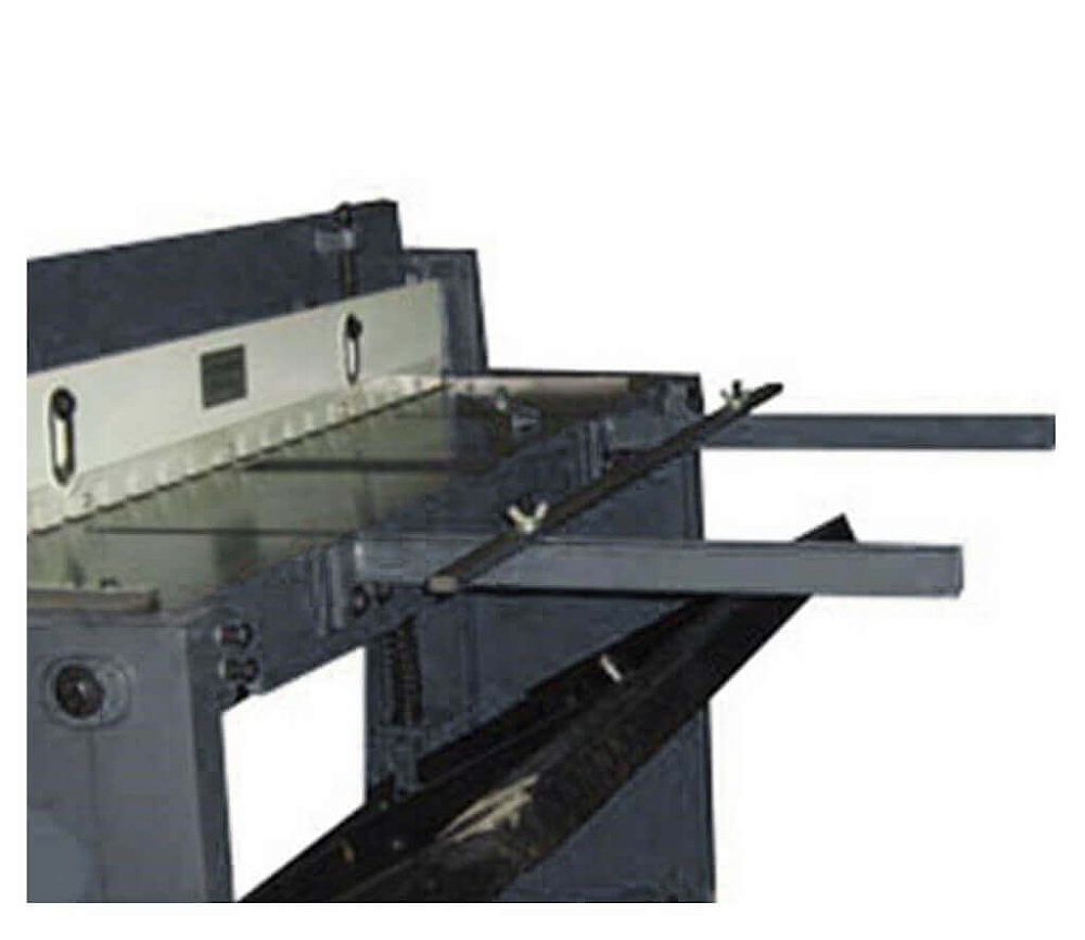 Подъем балки с верхним ножом осуществляется пружинами. Простота конструкции обеспечивает долговечность и неприхотливость станка. Для более точного расположения листа на рабочем столе станка, предусмотрены передние поддерживающие штанги, по которым перемещается передний упор. Этот элемент удобно использовать при подаче полосы листа из рулона в гильотину с тыльной стороны.