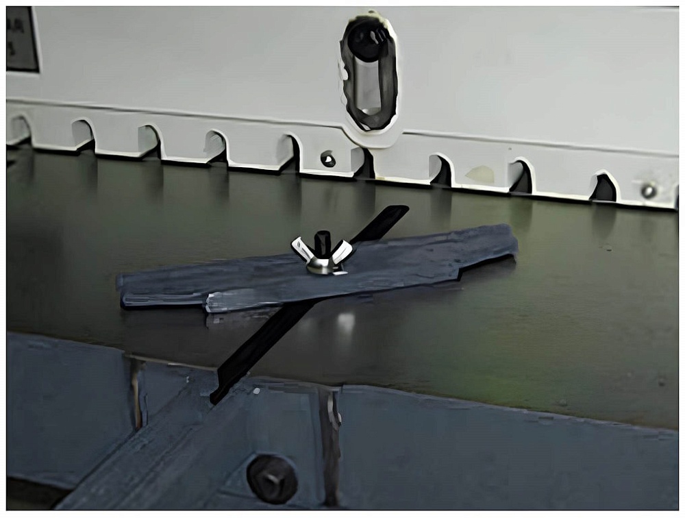 Рабочий стол снабжен боковыми упорами с двух сторон, по которым удобно выравнивать лист. На каждом упоре нанесена миллиметровая шкала, облегчающая позиционирование листа. Подвижная балка листогиба оснащена устройством защиты пальцев от повреждения. Стол гильотины имеет Т-образный паз, по которому перемещается упор для резки под углом.