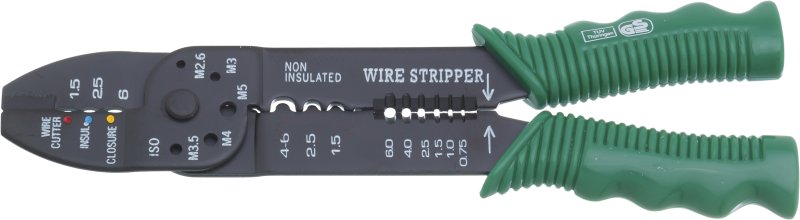 1932-9 Клещи для зачистки и обжимки проводов , 225 мм 5 функций в одном инструменте: *Резка проводов диаметром до 6 мм? *Снятие изоляции 0.75-6.0 мм? *Опрессовка изолированных наконечников 1.5 - 6.0мм? *Опрессовка не изолированных наконечников 1.5 - 6.0 *Резка болтов М2.5 –М5.0
