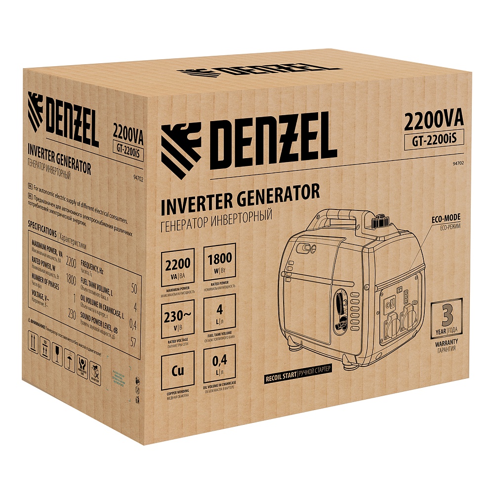 <p>Инверторный генератор Denzel GT-2200iS 94702 мощностью 2,2 кВт, в закрытом корпусе, с ручным стартом, — легкий и экономичный, но при этом достаточно мощный, с ним легко справится даже неопытный пользователь. Идеально подходит для выездов на природу и рыбалку, но также будет незаменим на дачном участке и в торговой палатке. Четырехтактный двигатель мощностью 3,2 л.с. и объемом 113 куб. см работает стабильно и имеет небольшой уровень шума 57 дБ.</p><h2>Преимущества</h2><ul><li>Высокое качество тока — генератор оптимален для подключения чувствительной электроники: компьютерной техники, газовых котлов с электронным управлением, охранных и пожарных систем.</li><li>Защита от поломки — при низком уровне масла, перегрузке или коротком замыкании двигатель автоматически отключается.</li><li>Долговечность — медная обмотка альтернатора увеличивает срок службы аппарата.</li><li>Надежность — корпус из прочного противоударного пластика защищает внутренние детали от повреждений.</li><li>Визуальный контроль — индикаторы на передней панели информируют о работе генератора, недостаточном уровне топлива и о перегрузке.</li><li>Экономичность — электронная система зажигания и электронный регулятор оборотов двигателя позволяют сберечь до 40% топлива, в зависимости от степени загрузки.</li><li>Долгая работа без дозаправки — генератор способен работать почти 5 часов на 4 л топлива.</li><li>Режим ECO — при работе с небольшой нагрузкой автоматически снижаются обороты двигателя, что позволяет еще больше снизить расход топлива.</li><li>2 розетки 230 В на передней панели — можно одновременно подключать пару потребителей без использования удлинителя.</li><li>Мобильность — благодаря комфортной ручке генератор удобно перемещать.</li><li>Гарантия 3 года — высокое качество генератора подтверждено производителем.</li></ul>