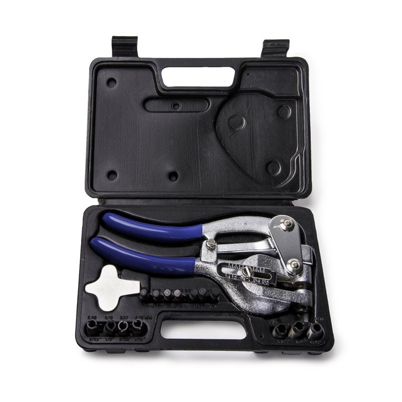 Универсальный кузовной дырокол для металла в кейсе. Позволяет вырезать ровные отверстия различного диаметра в листовом металле толщиной до 2 мм. Комплект состоит из насадок различного размера и дырокола, который способен развивать усилие в 1 тонну. Пластиковый кейс обеспечивает компактное хранение.