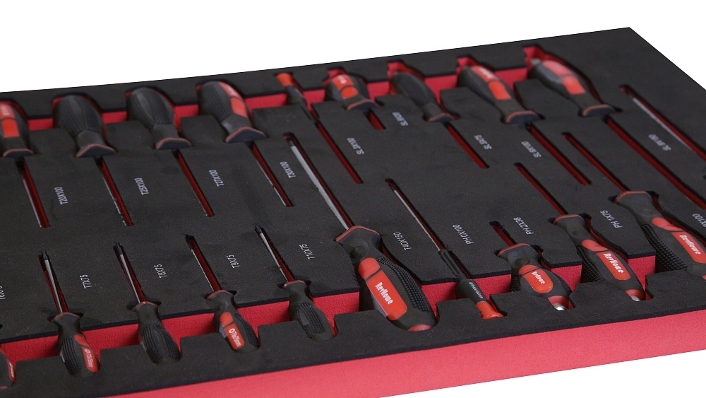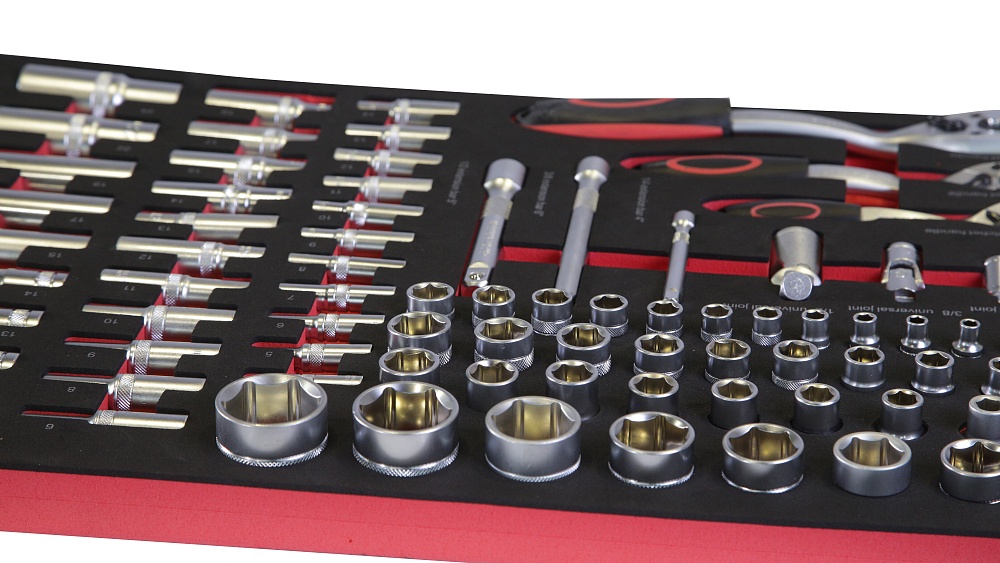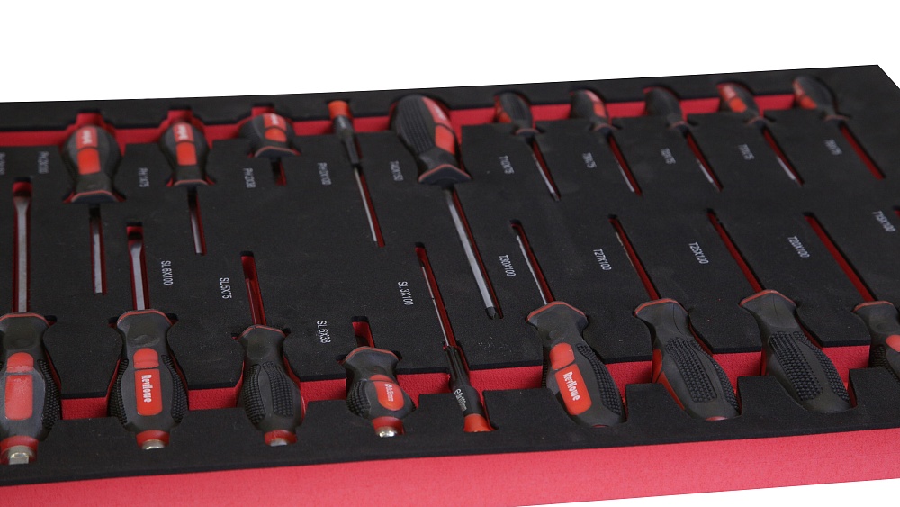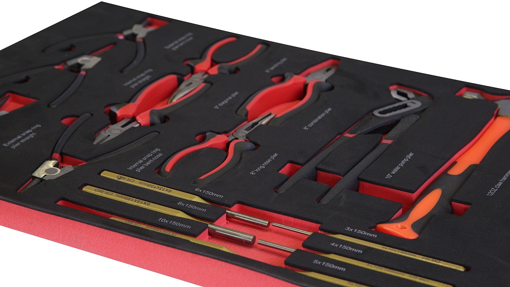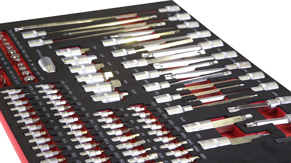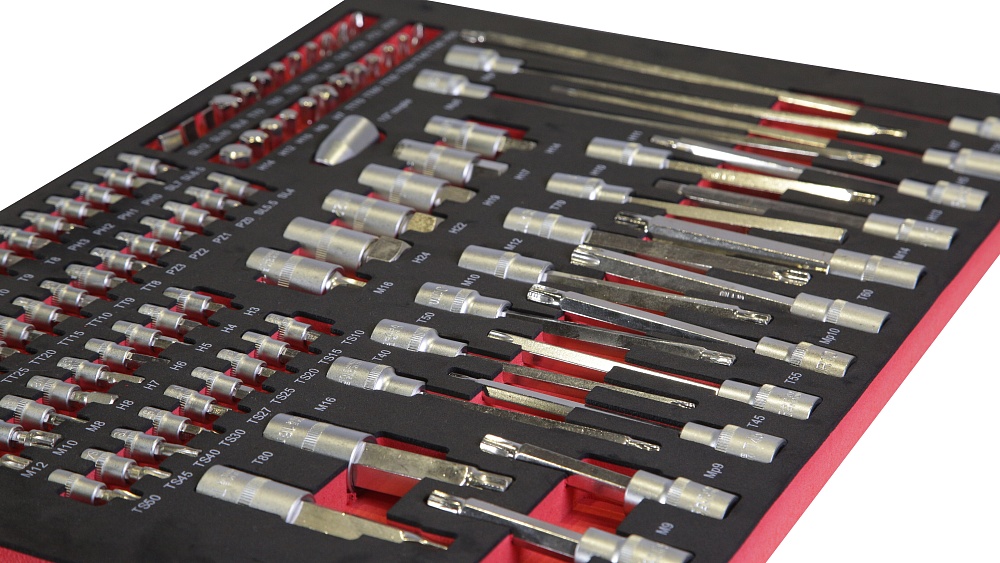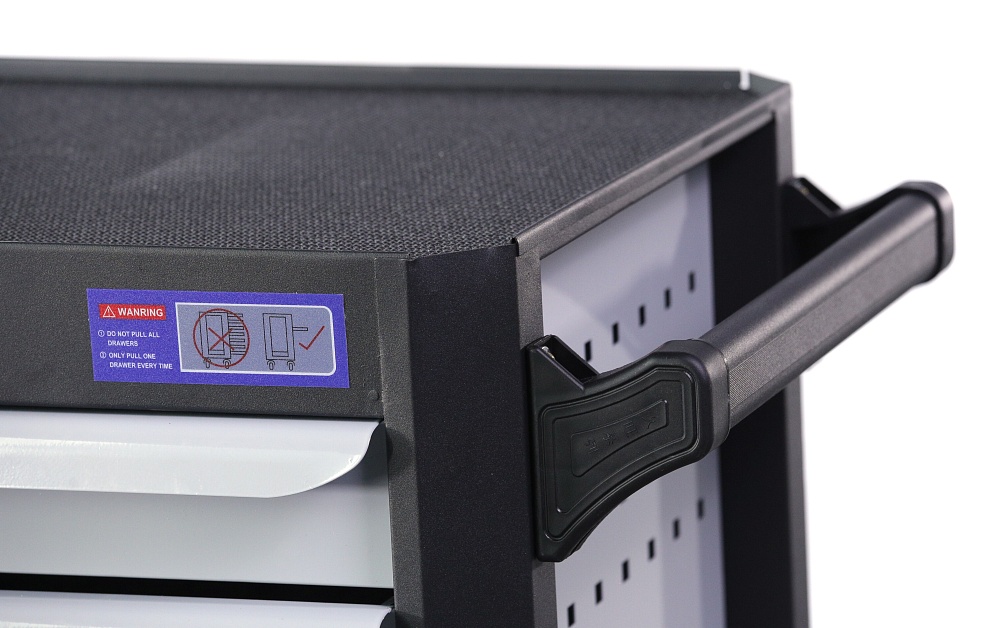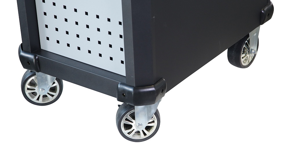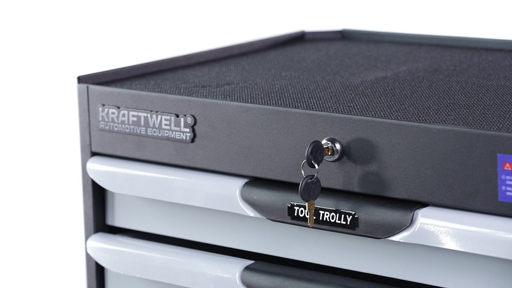 Инструментальная   тележка KRW-TTG оснащена 7-ю выдвижными ящиками.В ПОДАРОК 6 ящиков укомплектованы   ложементами с инструментом (277 предметов). Тележка предназначена для   оборудования рабочих мест в автосервисах, мастерских и других   производственных помещениях. Телескопические направляющие ящиков имеют   механизм фиксации, не позволяющий самопроизвольно открыться ящику, даже если   внутри находится инструмент, а также доводчиком, обеспечивающим плавное   закрытие ящика. Корпус тележки изготовлен из высококачественной стали и   окрашен порошковой краской. Перфорированные боковины предусматривают   установку крючков. Для перемещения тележки предусмотрены обрезиненные   стальные колеса Ф100 мм, одно   из которых имеет стояночный тормоз.