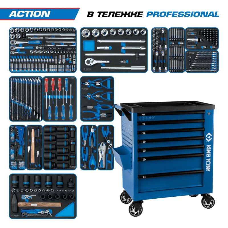 Набор инструментов 327 предметов, "ACTION", в синей тележке KING TONY 9G38-327MRVB купить в Ростове-на-Дону цена ✅ - Все для СТО