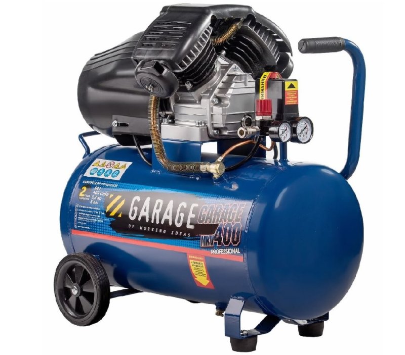 Компрессор Garage 100MKV400 профессиональной серии PRO предназначен для обеспечения сжатым воздухом гараж, небольшой автосервис или шиномонтаж. Высокая производительность 400 л/мин, мощный мотор 2.3 кВт и объемный ресивер позволяют работать практически со всеми видами пневматического инструмента.