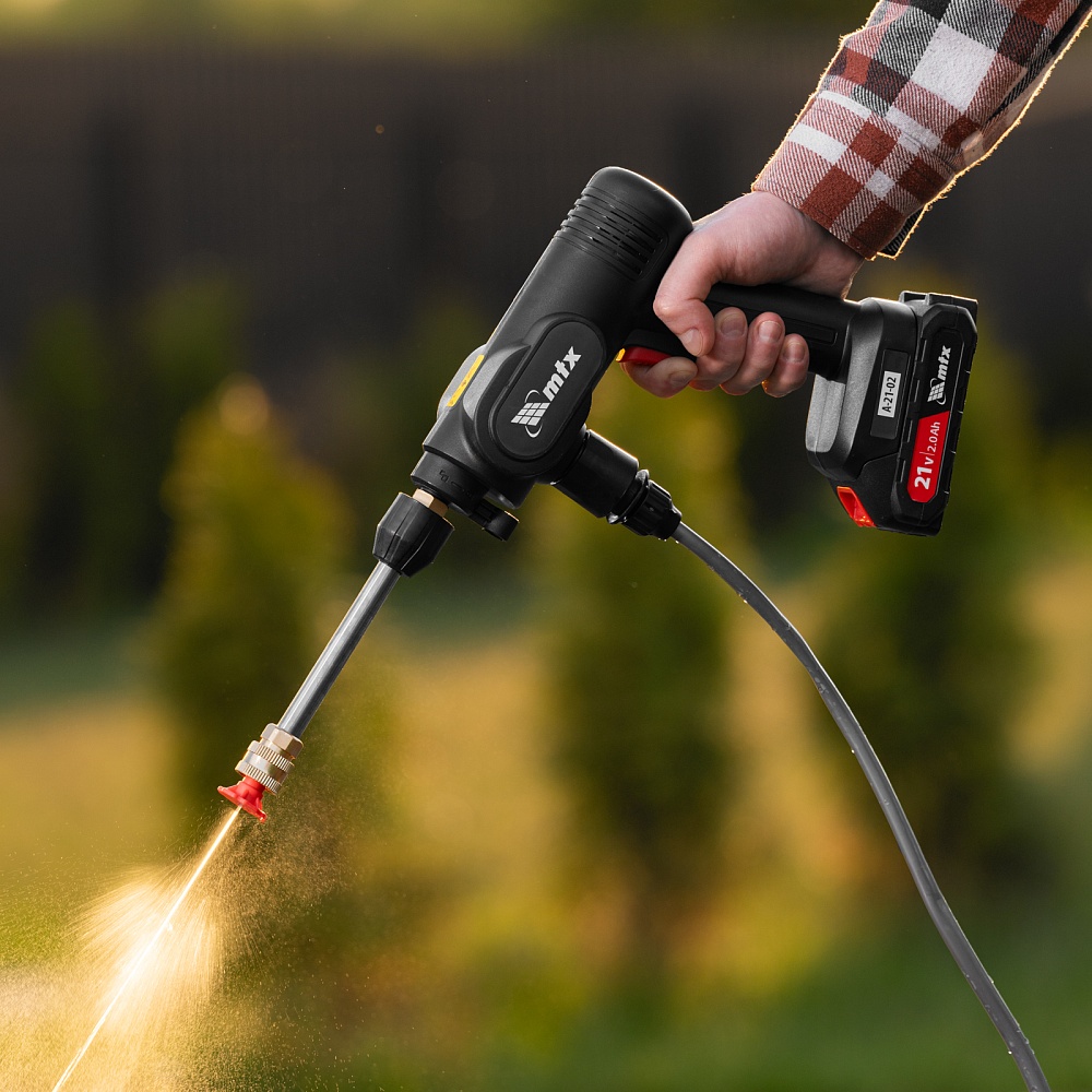Моечная машина высокого давления аккумуляторная А-21-02, 40 бар, 4 л/мин, Li-ion 21 В, 2 акк.// MTX