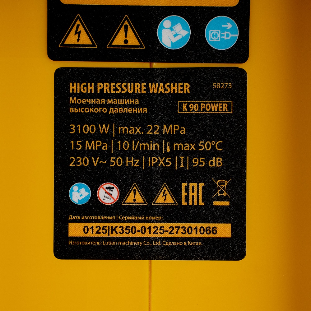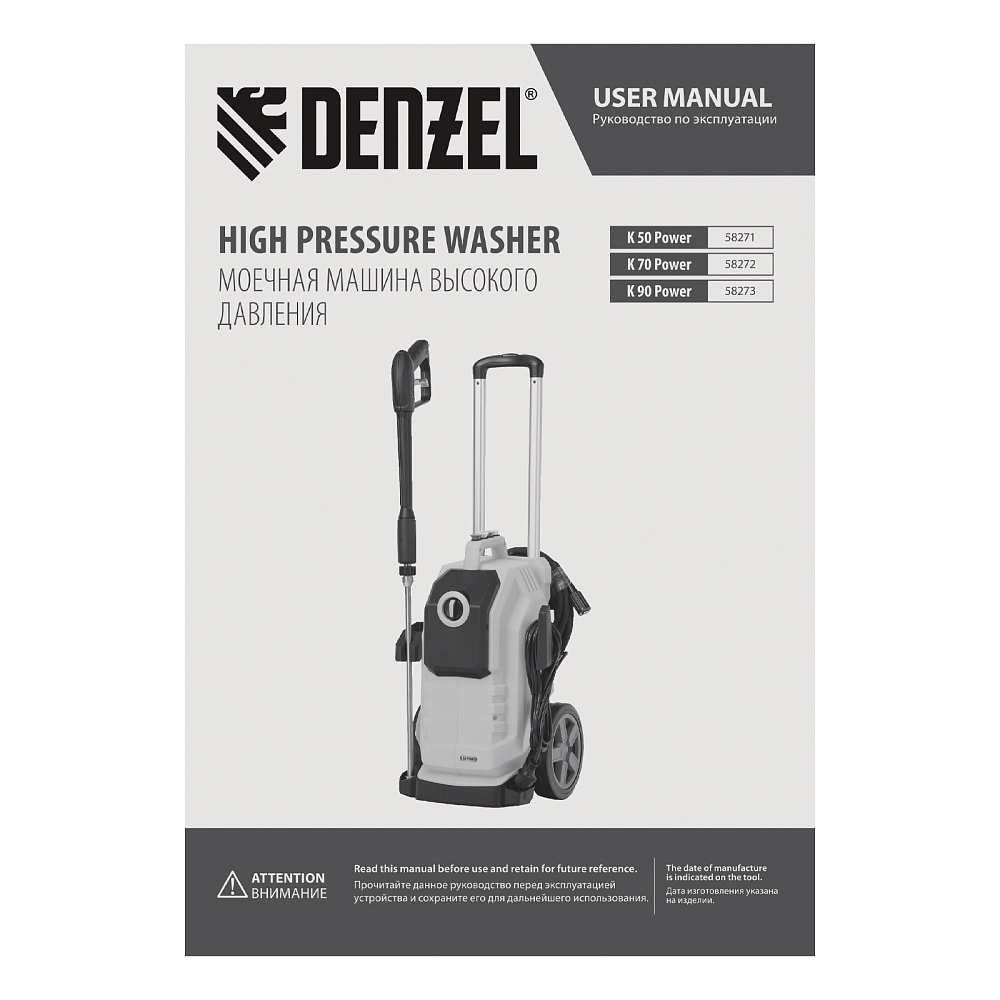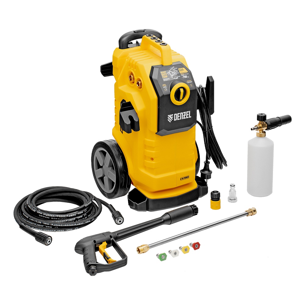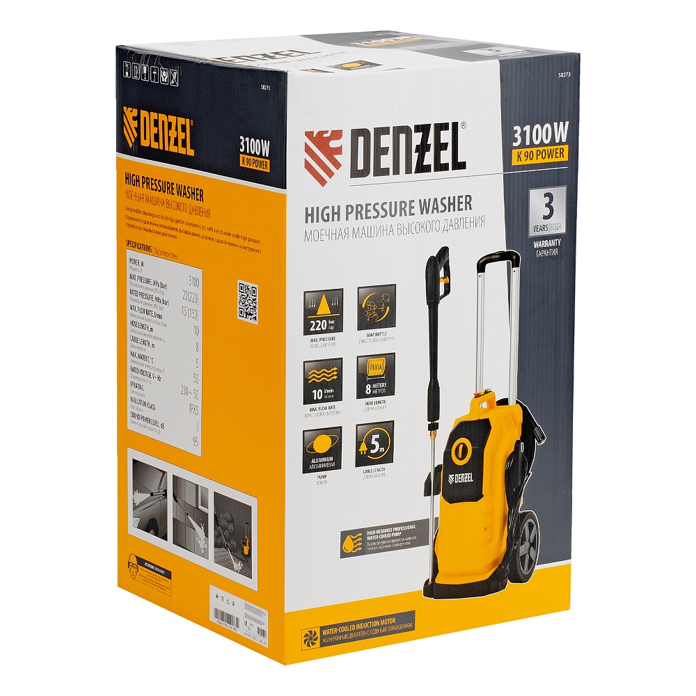<p>Моечная машина высокого давления Denzel K 90 Power 58273 мощностью 3100 Вт и производительностью 600 л/ч, с асинхронным двигателем, обеспечивает подачу воды под давлением до 220 бар. Позволяет при помощи струи воды отмыть фасад дома, дорожку, тротуар, садовую мебель, технику и инструменты, автомобиль, окна и т.д. Машина оснащена самовсасывающим насосом, поэтому может работать даже при отсутствии доступа к водопроводной сети, забирая воду из открытого источника. Надежный асинхронный двигатель с водяным охлаждением устойчив к нагрузкам и не требует сложного обслуживания. Машина оптимальна для бытового применения.</p><h2>Преимущества</h2><ul><li>Высокий ресурс — профессиональная алюминиевая помпа с водяным охлаждением обеспечивает стабильное давление в течение длительного времени: испытаниями подтверждена возможность непрерывной работы на протяжении 700 часов.</li><li>4 насадки в комплекте — возможно распыление под углом 0, 15, 25 и 40° для наиболее эффективного решения поставленных задач.</li><li>Эффективное очищение — возможно использование моющих средств, для этого предусмотрен специальный бачок с насадкой пеногенератора.</li><li>Защита от засоров — фильтр входного штуцера препятствует попаданию посторонних частиц внутрь машины.</li><li>Быстрая подготовка к работе — быстросъемный адаптер упрощает подключение входного шланга.</li><li>Продуманная конструкция — сменные насадки и бачок для моющего средства крепятся на корпус машины, поэтому он всегда будут под рукой и не потеряются.</li><li>Степень защиты IPX5 — внутренние элементы машины надежно изолированы от попадания влаги.</li><li>Защита от непроизвольного запуска — для включения машины необходимо разблокировать рычаг моечного пистолета.</li><li>Автоматический контроль давления — манометрический выключатель останавливает насос при прекращении подачи воды, перепускной клапан предотвращает превышение допустимого рабочего давления.</li><li>Термозащита — в случае перегрева двигатель отключается для предотвращения поломки.</li><li>Простое обслуживание — игла для прочистки сопла входит в комплект поставки.</li><li>Мобильность — машину удобно перемещать благодаря телескопической рукоятке и большим колесам.</li><li>Свободное перемещение по участку — длина шланга высокого давления составляет 8 м, длина кабеля — 5 м.</li><li>Гарантия 3 года — надежность моечной машины подтверждена производителем.</li></ul>