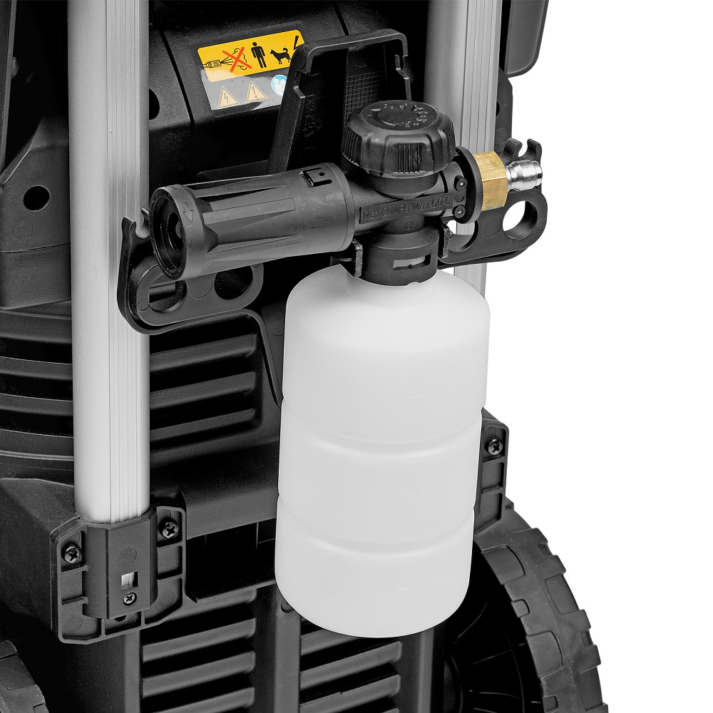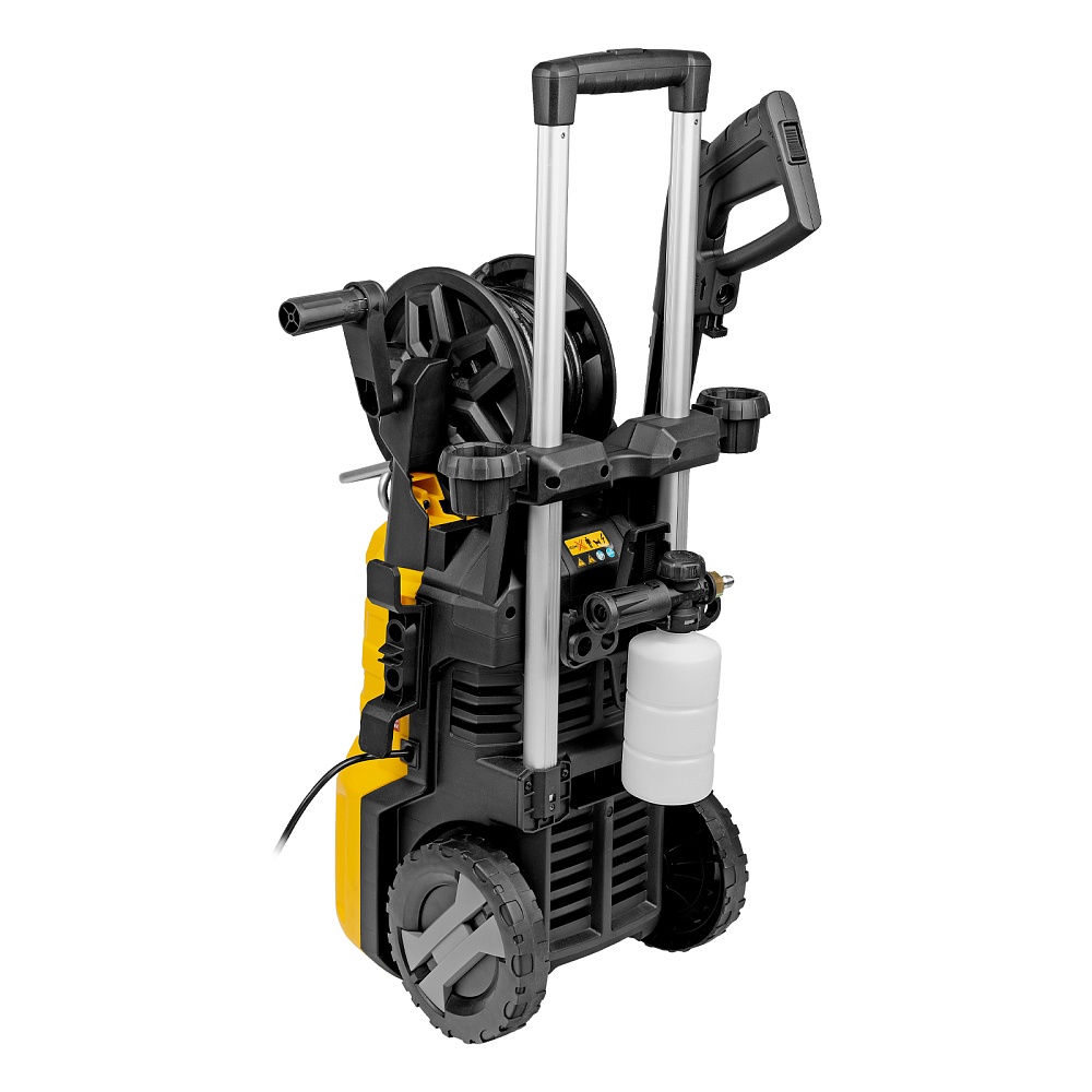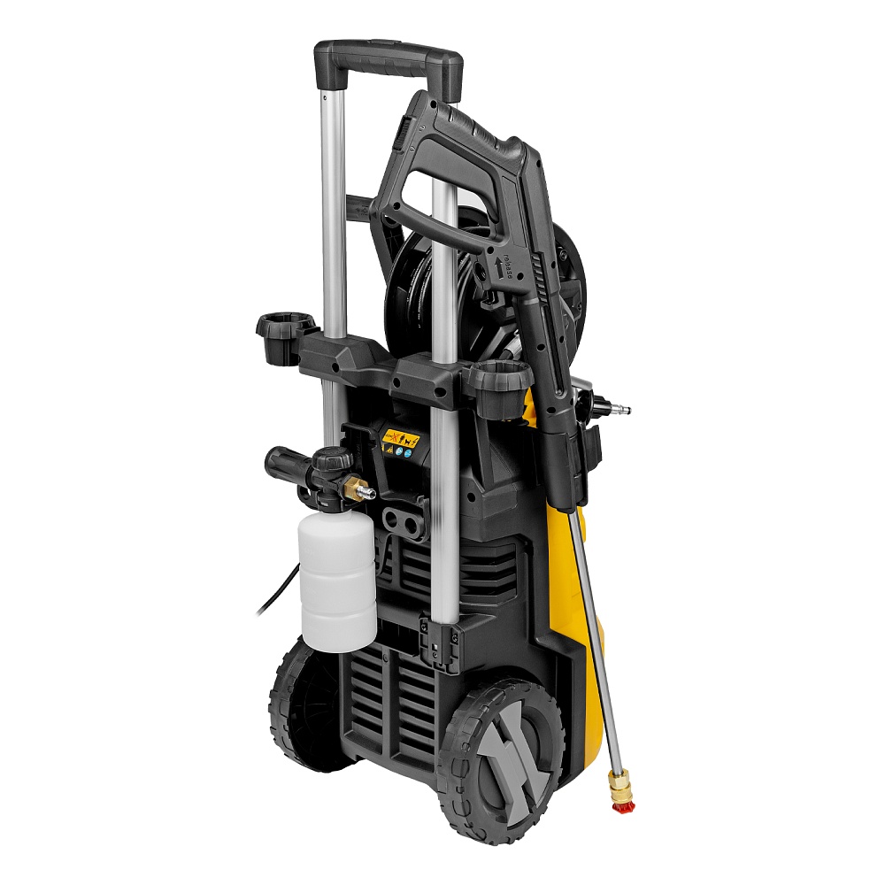 Мойка высокого давления, Барабан для шланга (установлен), Шланг высокого давления (установлен), Пистолет, Удлинитель пистолета, Сменные сопла 3 шт, Пеногенератор с бачком для моющего средства, Входной штуцер с фильтром, Быстросъемный коннектор шланга, кронштейн-держатель пистолета, Кронштей сетевого кабеля, Игла для прочистки сопла, Комплект крепежа, Инструкция с гарантийным талоном