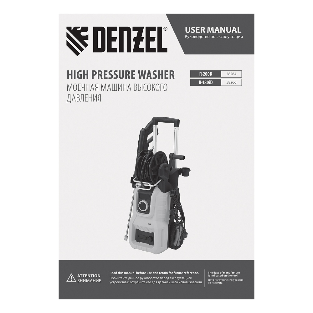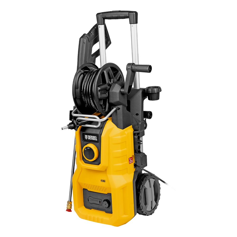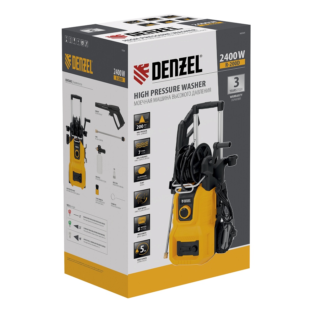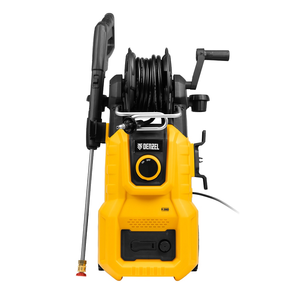 <p>Моечная машина высокого давления Denzel R-200D 58264 мощностью 2400 Вт, с барабаном, используется для мытья дорожек, тротуаров, фасадов зданий, автомобилей, окон, садовой мебели и инвентаря. Максимальное давление составляет 200 бар, производительность — 420 л/ч. Мойка подключается к водопроводной сети, а в случае ее отсутствия может забирать воду из любого открытого резервуара, работая в режиме самовсасывания. Надежная алюминиевая помпа со стальными плунжерами обеспечивает стабильное давление даже при длительном интенсивном использовании. Техника незаменима на дачном участке. </p><h2>Преимущества</h2><ul><li>Максимально эффективное очищение — к мойке прилагается внешний пенокомплект с функцией улучшенного пенообразования, быстросъемное крепление позволяет устанавливать его на пистолет одним движением.</li><li>Выбор оптимального угла распыления — машина поставляется с 3 насадками: 0°, 25° и 40°.</li><li>Быстрая подготовка к работе — быстросъемный адаптер упрощает подключение шланга подачи воды.</li><li>Качественная фильтрация — посторонние частицы задерживаются на входе, что защищает помпу от поломки.</li><li>Защита от случайного пуска — перед началом работы необходимо разблокировать рычаг моечного пистолета.</li><li>Защита от превышения допустимого давления — машина оснащена перепускным клапаном, пневматическое реле останавливает насос при отпущенном рычаге пистолета и запускает после нажатия на курок.</li><li>Термозащита — производитель предусмотрел датчик температуры, электродвигатель автоматически отключается при перегреве.</li><li>Максимально комфортное передвижение — длина шнура питания составляет 5 м, длина шланга высокого давления увеличена до 8 м.</li><li>Удобное использование — функциональный барабан подключен к магистрали высокого давления, поэтому вы можете разматывать и убирать шланг на барабан, не отсоединяя его от мойки.</li><li>Степень защиты IPX5 — внутренние компоненты надежно изолированы от попадания воды.</li><li>Мобильность — благодаря колесам и телескопической рукоятке машину удобно перемещать по участку.</li><li>Несложный уход — в комплект поставки входит игла для прочистки сопла.</li><li>Продуманное хранение — в конструкции предусмотрен кронштейн для кабеля, а также держатели для аксессуаров.</li><li>Гарантия 3 года — надежность техники подтверждена производителем.</li></ul>