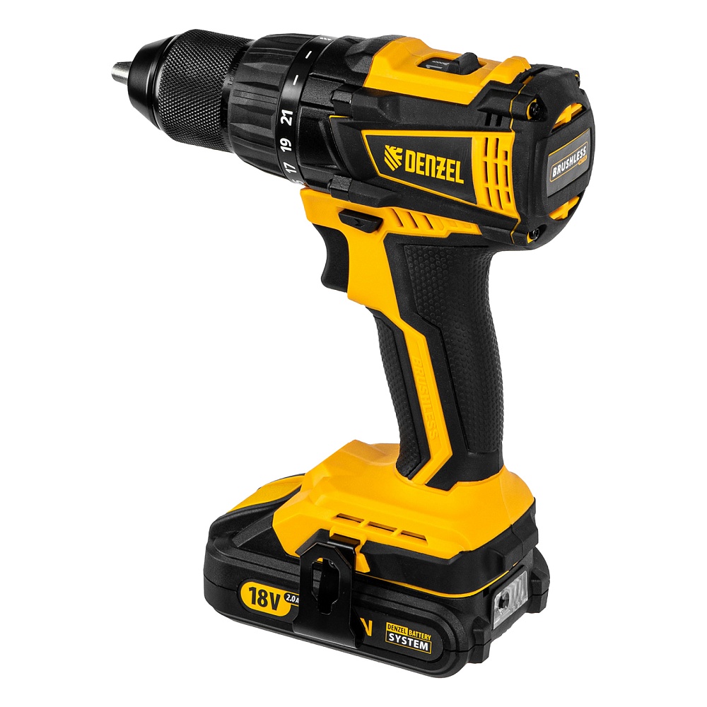 <p>Бесщеточная аккумуляторная дрель-шуруповерт Denzel BLDL-IB-18-02 26121 с  2 батареями 2 Ач Li-Ion на 18 В используется для выполнения большого спектра работ. Благодаря мощному бесщеточному двигателю, позволяющему развивать крутящий момент 65 Н·м, имеет КПД на 20-30% больше, чем у коллекторных дрелей. Инструмент легко справляется с закручиванием и откручиванием винтов, шурупов, саморезов, а также сверлением древесины, пластика, металла и размешиванием легких строительных смесей. Сверлит отверстия диаметром до 13 мм в металле и до 25 мм в древесине.</p><h2>Преимущества</h2><ul><li>Надежность и долговечность — металлический корпус редуктора устойчив к нагрузкам, бесщеточный двигатель отличается высокой производительностью.</li><li>Легкая замена оснастки — быстрозажимной одномуфтовый металлический патрон в сочетании с функцией блокировки шпинделя позволяет одной рукой устанавливать биту или сверло.</li><li>Два режима работы — можно установить скорость 0-500 / 0–2000  об/мин для работы с крепежом или получения отверстий в конструкционных материалах.</li><li>Настройка крутящего момента — 21+1 ступень регулировки усилия затягивания позволяет подстроиться под размер крепежа и твердость материала.</li><li>Высокая точность выполняемых работ — тормоз свободного выбега позволяет мгновенно остановить вращение шпинделя после выключения и избежать перетягивания крепежа.</li><li>LED-подсветка рабочей зоны — инструментом можно работать даже в малоосвещенных помещениях.</li><li>Быстрое переключение между задачами — функция реверса позволяет быстро переходить от закручивания к откручиванию крепежа, а также работать с болтами и гайками, имеющими левую резьбу.</li><li>Комфортная эксплуатация — обрезиненная рукоятка удобно лежит в руке и поглощает вибрации.</li><li>Универсальность — аккумуляторы 2 Ач Li-ion с интеллектуальной системой распознавания нагрузки совместимы с любым инструментом 18V Denzel battery system.</li><li>Надежные аккумуляторы — элементы питания с защитой от глубокого разряда и нежелательного перезаряда имеют увеличенный срок службы.</li><li>Бесперебойная работа — в комплект входит 2 аккумулятора емкостью 2 А/ч, время полной зарядки составляет 1 час, а индикатор уровня заряда подскажет, когда нужно заменить батарею.</li><li>Удобное хранение и транспортировка — инструмент поставляется в прочном пластиковом кейсе.</li><li>Гарантия 3 года — высокое качество дрели-шуруповерта подтверждено производителем.</li></ul>