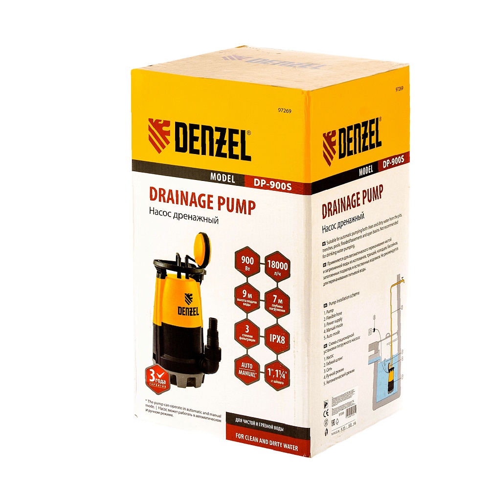 <p>Дренажный насос Denzel DP-900S 97269 мощностью 900 Вт и производительностью 18000 л/ч обеспечивает напор 9 м и эффективно справляется с выкачиванием из затопленных помещений грязной воды с фракциями диаметром до 30 мм. Также используется для подачи чистой воды из колодцев и водоемов или организации системы полива сада и огорода. Благодаря небольшим габаритам подходит для установки  в узких колодцах.</p><h2>Преимущества</h2><ul><li>Простая установка — с помощью троса насос опускается в вертикальном положении на глубину до 7 м.</li><li>Надежность — корпус из прочного пластика, торцевое уплотнение из карбида кремния и вал из нержавеющей стали рассчитаны на длительное использование.</li><li>Быстрое подключение — универсальный патрубок 1 1/4"  и 1" позволяет подсоединять шланг без переходника.</li><li>Автономная работа — поплавковый механизм защищает насос от работы на сухом ходу.</li><li>Степень защиты IPX8 — электронные компоненты надежно защищены от попадания воды.</li><li>Универсальность — в комплекте 2 сменных основания для перекачки воды разной степени загрязнения.</li><li>Кабель длиной 10 м — насос можно использовать даже на большой глубине.</li><li>Удобное перемещение — на корпусе имеется транспортировочная ручка.</li><li>Гарантия 3 года — высокое качество насоса подтверждено производителем.</li></ul>