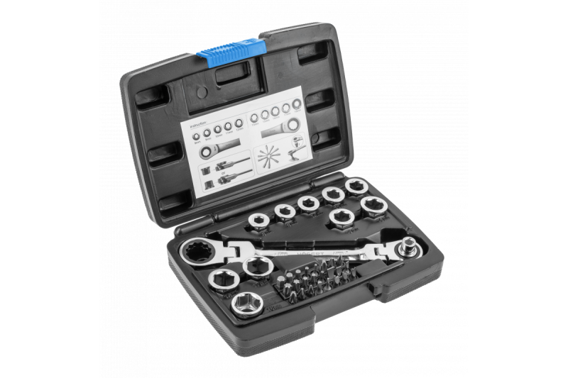 Ключ с трещоткой и шарниром  и набором специальных насадок, которые идеально подходят  для откручивания и закручивания резьбовых соединений с шести или двенадцатигранными крепежными элементами. Благодаря трещотке отсутствует необходимость перекладывания ключа, а  насадки позволяют  работать  с болтами разных размеров. 36 элементов набора позволяют использование полного набора  ключей размером 8-19мм.  Дополнительно набор содержит 24 отверточных  биты с  адаптером.  Универсальные   возможности  ключа позволяют его  использовать  как в мастерских, так и в ремонтно  - строительных и монтажных работах.