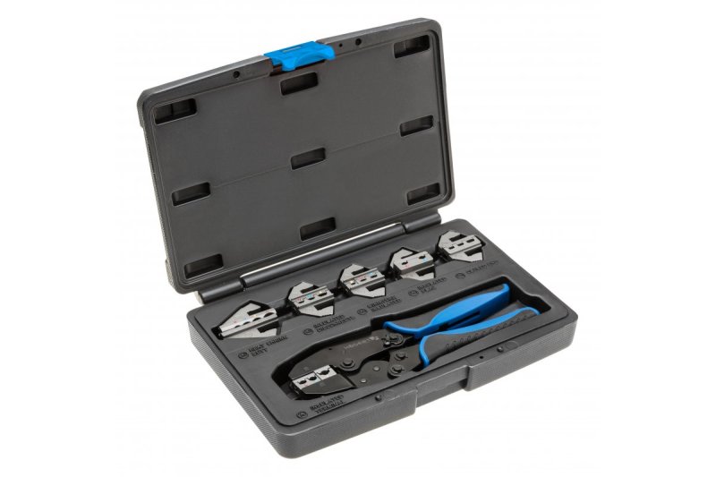 Обжимные клещи со сменными губками. Набор из 6 губок. Система маркировки облегчает правильную сборку губок. Используются в автомеханике, телекоммуникациях, электронике и других сборочных работах – возможность любого выбора обжимных матриц позволяет адаптировать инструмент к индивидуальным потребностям.