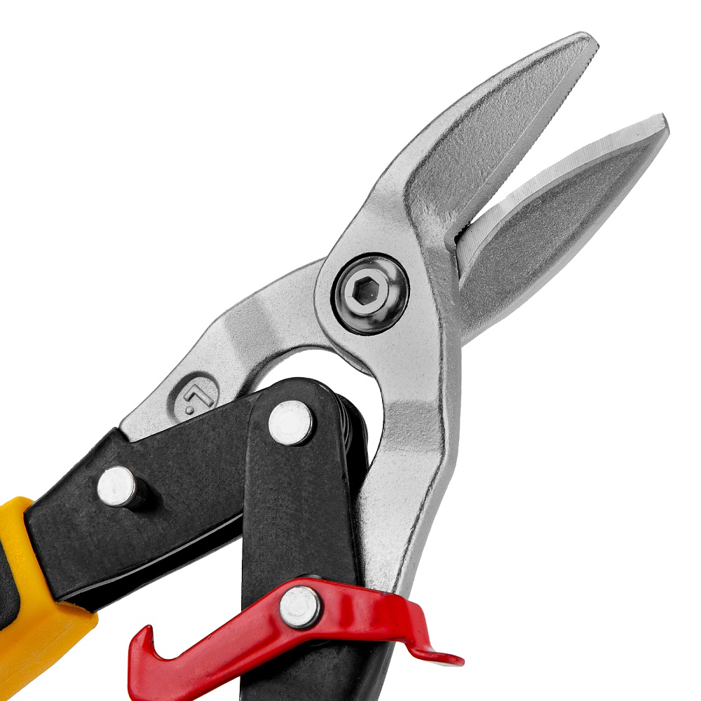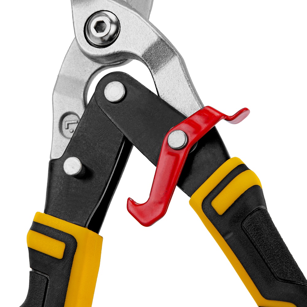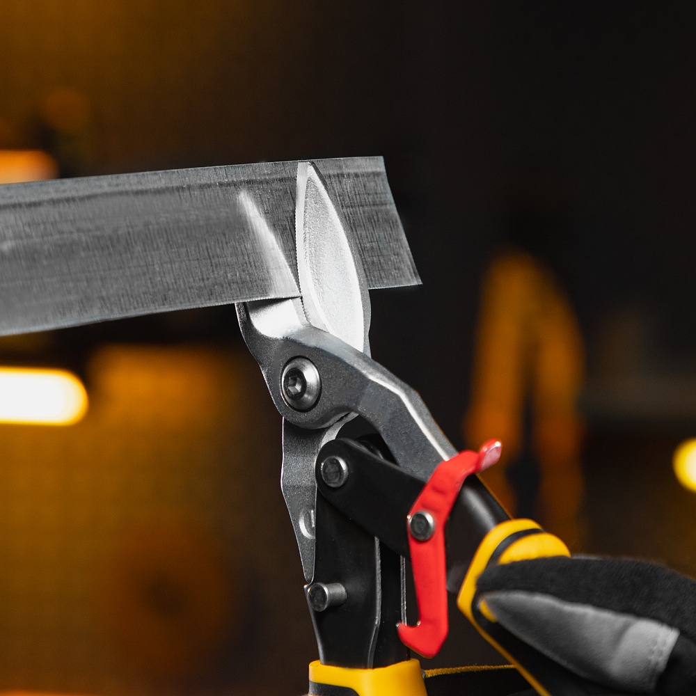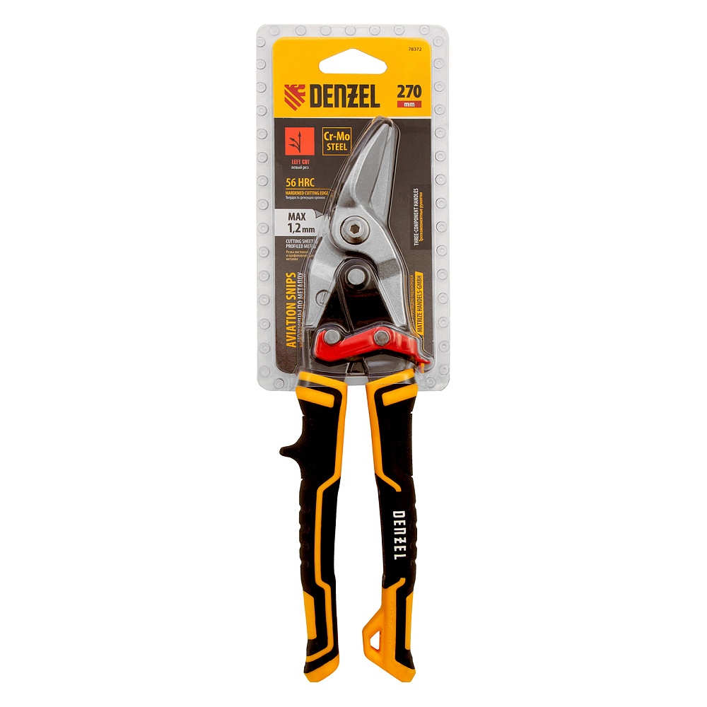 <p>Ножницы по металлу Denzel 78372 общей длиной 270 мм, из стали-CrMo, с трехкомпонентными рукоятками, предназначены для прямого и левого реза листовых металлических заготовок и металлопрофиля толщиной до 1,2 мм. Инструмент с усиленной конструкцией осевого шарнира рассчитан на профессиональное использование. Ножницы используются для проведения строительных, кровельных и слесарных работ.</p><h2>Преимущества</h2><ul><li>Высокое качество исполнения — ножницы изготовлены из прочной хромомолибденовой стали методом горячей штамповки, остро заточенные кованые лезвия с насечками не соскальзывают с заготовок.</li><li>Эффективность — режущие кромки закалены до твердости 60-62 HRC и легко справляются даже с прочной «нержавейкой».</li><li>Безопасность — блокировочный замок предотвращает случайное раскрытие лезвий во время транспортировки и хранения.</li><li>Комфортная работа — плоский соединительный винт не цепляется за заготовки, удлиненные трехкомпонентные рукоятки не выскальзывают из руки.</li><li>Удобное хранение — на рукоятке имеется проушина для подвешивания на крючок или гвоздь.</li></ul>