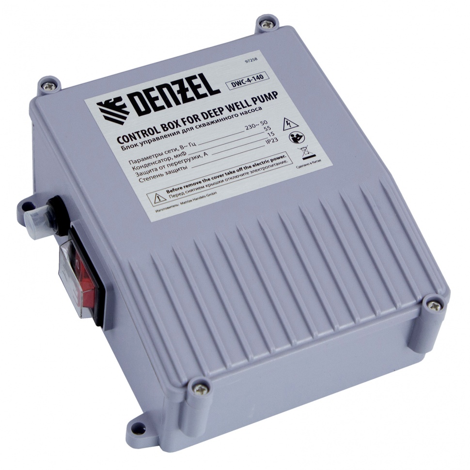 <p>Скважинный насос Denzel DWC-4-140 97258 производительностью 6000 л/ч, диаметром 4″ и мощностью 2200 Вт обеспечивает напор до 140 м. Предназначен для подачи чистой воды из скважин, колодцев, систем водоснабжения, различных накопителей и пресных водоемов с глубины до 27 м (с наращиванием кабеля — до 80 м). Насосная часть из 19 центробежных импеллеров обеспечивает повышенную производительность, что позволяет организовать не только полив приусадебных участков, но и бытовое водоснабжение. </p><h2>Преимущества</h2><ul><li>Надежность — маслонаполненный двигатель с мембраной компенсации теплового расширения обеспечивает стабильную работу даже при интенсивных нагрузках.</li><li>Коррозионная стойкость — корпус и винты выполнены из нержавеющей стали, крышки корпуса — из латуни.</li><li>Удобное управление — насос подключается к выносному блоку с реле защиты от перегрузки и выключателем питания.</li><li>Электробезопасность — длина съемного сетевого кабеля составляет 30 м (возможно его наращивание), штепсельная вилка оснащена заземляющим контактом.</li><li>Водонепроницаемость — рабочий узел защищен от попадания воды по стандарту IPX8. </li><li>Система защиты от перегрева — при превышении допустимой температуры двигатель отключается для предотвращения поломки.</li><li>Быстрое начало работы — напорная магистраль легко подключается к выходному отверстию, образуя герметичное соединение, насос не нужно заполнять водой, достаточно погрузить его в скважину и включить.</li><li>Несложная установка — в верхней части корпуса имеются проушины для закрепления троса, при помощи которого насос погружается в воду.</li><li>Работа без остановок — насос не останавливается при попадании песка и других частиц размером до 0,5 мм, заборная часть легко очищается при необходимости.</li><li>Простая подготовка к хранению — достаточно промыть насос, слить из него воду и протереть чистой тряпкой.</li><li>Гарантия 3 года — надежность насоса подтверждена производителем.</li></ul>