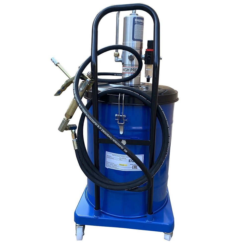 Корпус нагнетателя смазки – стальной, насос изготовлен из анодированной стали. Фиксация насоса с крышкой к баку для смазки производится с помощью металлических защелок с резьбой. Для удобства транспортировки нагнетатель оборудован металлической ручкой в верхней части корпуса. Нагнетатель оборудован маслобензостойким армированным шлангом длиной 4 м. Солидолонагнетатель для консистентной смазки, установленный на колесах, имеет легкий вес и экономичную конструкцию для удобства перемещения и эксплуатации.