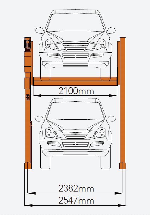Двухстоечный электрогидравлический наклонный парковочный подъемник, грузоподъемностью 2000 кг. Для помещений с низким потолком.