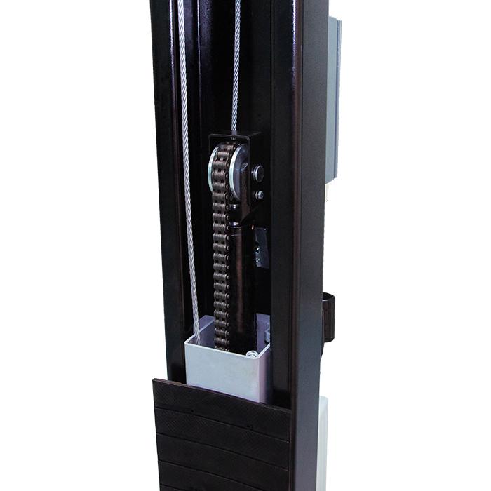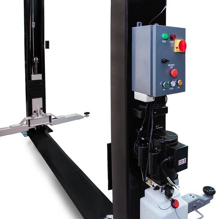 Двухстоечный электрогидравлический подъемник с нижней синхронизацией, грузоподъемность 4 т, механическое управление стопорами на одной колонне.