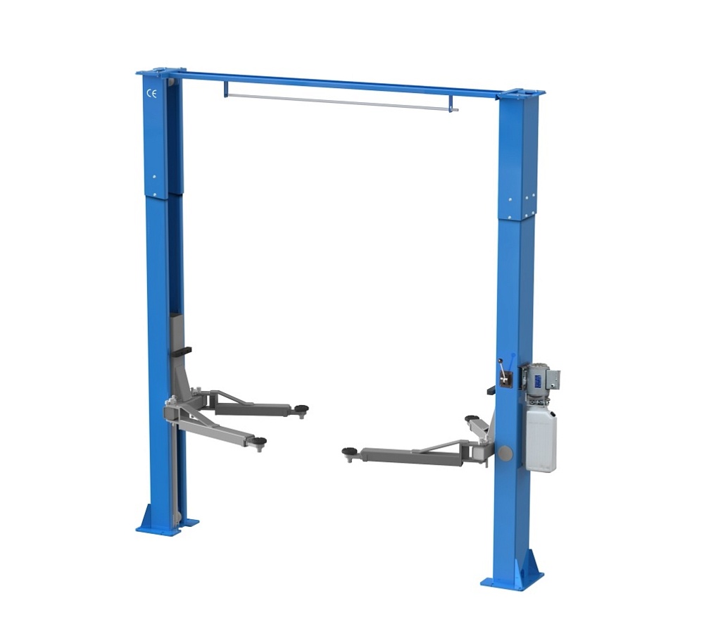 Подъемник двухстоечный электрогидравлический, асимметричный, двухцилиндровый, г/п 4000 кг., 2,2 кВт, высота подъема 1800 мм., расстояние между стойками 2760 мм., с нижней синхронизацией стальным тросом.