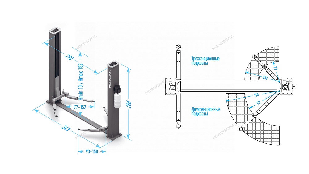 Подъемник 380V 2х стоечный с нижней синхрониз. г/п 4,5т NORDBERG N4124A-4,5T