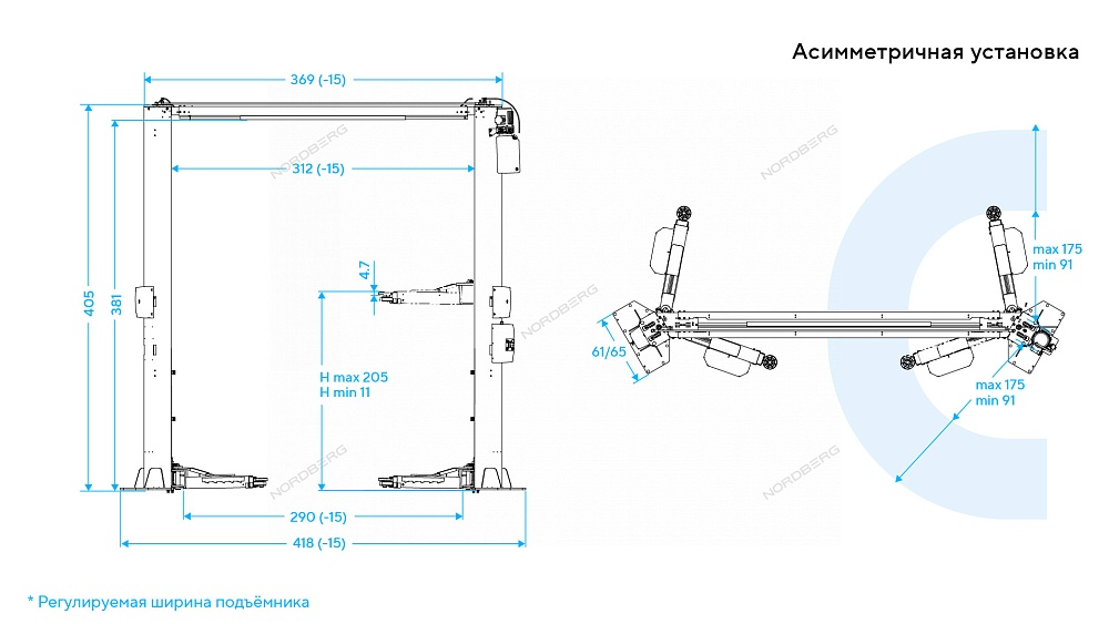 Двухстоечные электрогидравлические подъемники с верхней синхронизацией, симметричное или ассиметричное (по выбору пользователя) расположение стоек.
