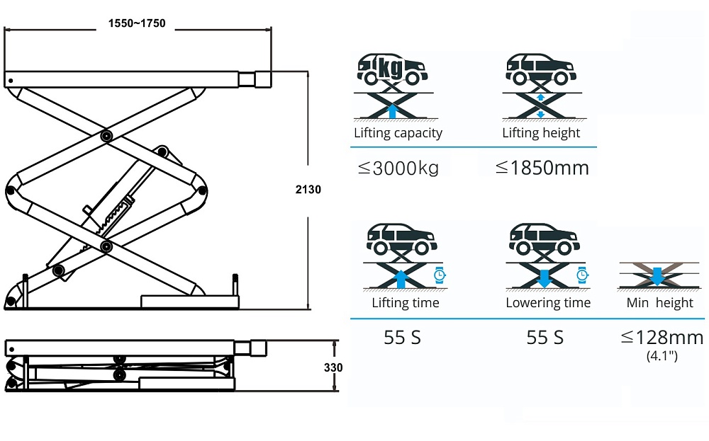 Подъемник оснащён пневматическим стопорным механизмом, требует подключения к пневмолинии. Раздвижные платформы увеличивают рабочую длину с 1550 до 1750 мм. Максимальная высота подъема — 2130 мм, высота от уровня пола — 1800 мм, заглубление — 330 мм. Расстояние между платформами — 780 мм. Стойка управления располагается отдельно, что упрощает размещение в помещении.