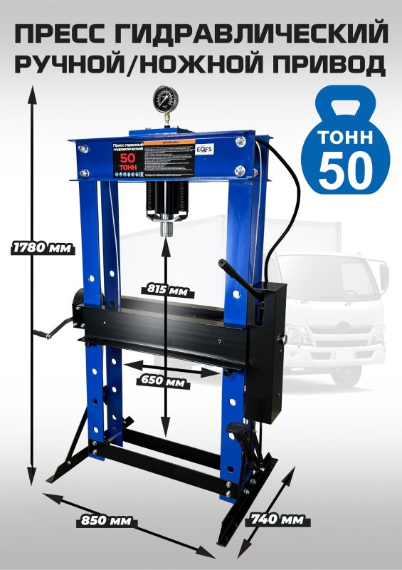 Пресс гидравлический 50 тонн ножной / ручной для автосервиса, усилие 50 тонн. «Свободные руки». ножной / ручной. Пуансон 0-230 мм. Рабочее окно 650х815 мм. Доставка по РФ и ТС. Поршень приводится в действие нажатием на ручку или педаль. Рекомендуется для выпрессовки подшипников, деталей машин, втулок и т.п. в автосервисе, гараже и СТО. Цвет синий.