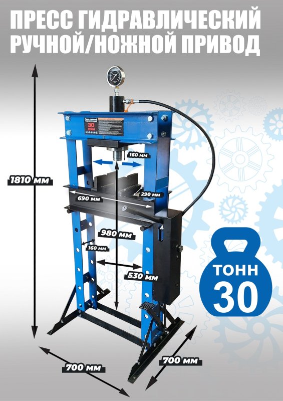 Пресс гидравлический ручной укомплектован насосом с одной плунжерной парой и максимальным усилием 30т.