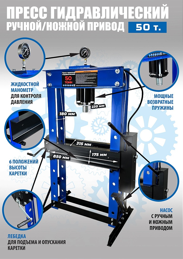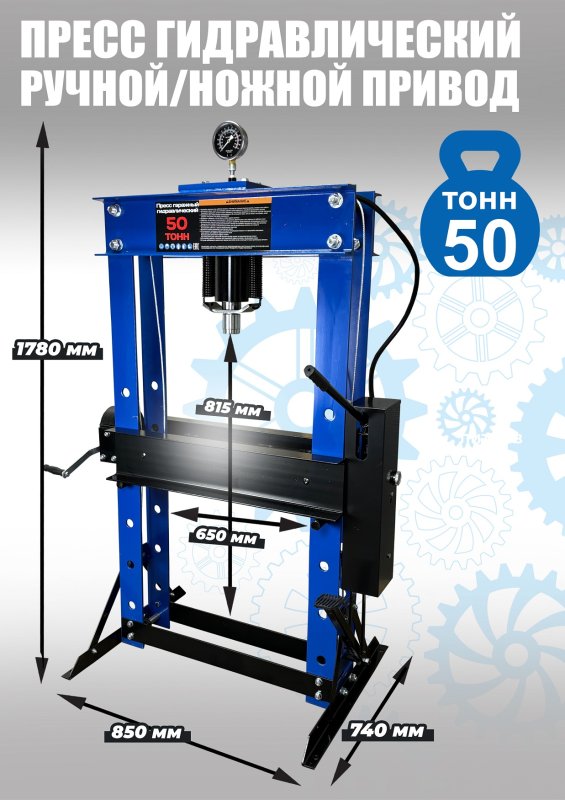 Пресс гидравлический ножной / ручной для автосервиса, усилие 50 т. «Свободные руки». ножной / ручной 50 тонн. Пуансон 0-230 мм. Рабочее окно 650х815 мм. Доставка по РФ и ТС. Поршень приводится в действие нажатием на ручку или педаль. Рекомендуется для выпрессовки деталей машин, втулок и т.п. в автосервисе, гараже и СТО. Цвет синий.