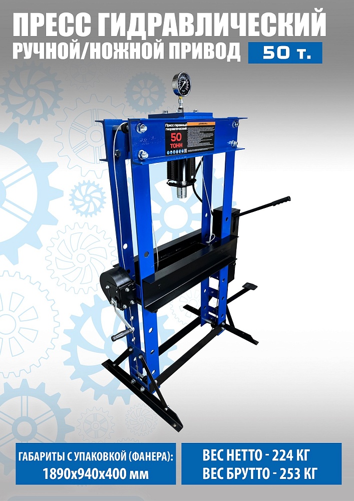 Пресс гидравлический ручной укомплектован насосом с одной плунжерной парой и максимальным усилием 50т.
