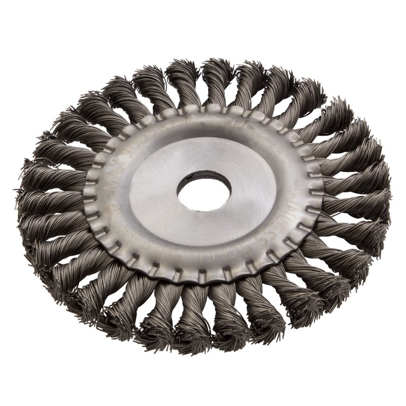 <p>Плоская щетка для УШМ Denzel 746343 диаметром 150 мм, с посадкой 22,2 мм, с щетиной из крученой нержавеющей проволоки 0,5 мм, предназначена для снятия толстого верхнего слоя с металлических, деревянных, бетонных поверхностей. Удаляет загрязнения, ржавчину, старые лакокрасочные покрытия, заусенцы, окалину с ровных поверхностей и в труднодоступных местах. Оптимальна для обработки изделий из нержавеющей стали, а также зачистки сварных швов. Щетку устанавливают на фланец углошлифовальной машины, что удобно для выполнения большого объема работ, не требующих частой смены насадок. Рекомендуемая максимальная скорость вращения 9000 об/мин. Во время работы обязательно использование средств индивидуальной защиты. Щетка будет полезна на строительной площадке, производственном предприятии, а также пригодится в быту.</p><h2>Преимущества</h2><ul><li>Щетина из проволоки толщиной 0,5 мм, скрученной в пучки, выдерживает повышенные нагрузки.</li><li>Оцинкованный корпус и щетина из нержавейки не боятся коррозии, поэтому щетку можно использовать в районах с высокой влажностью.</li><li>Частицы проволоки из нержавеющей стали AISI 201 не вызывают коррозии обработанной поверхности.</li><li>Усиленный корпус обеспечивает щетке повышенную устойчивость к деформациям.</li><li>Технологический контроль на всех этапах производства гарантирует высокое качество оснастки.</li></ul>