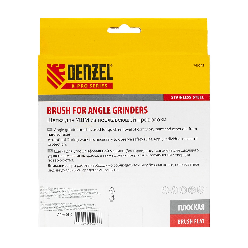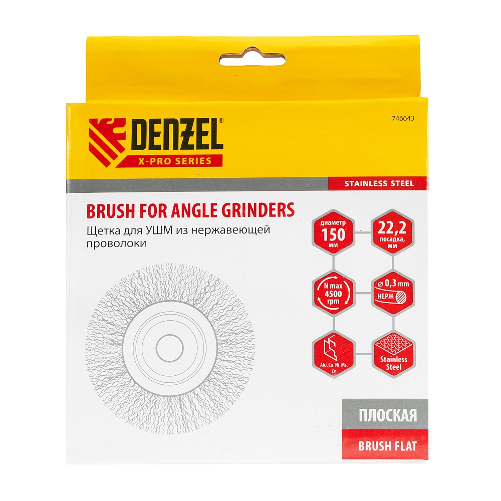 <p>Плоская щетка для УШМ Denzel 746643 диаметром 150 мм, с щетиной из витой нержавеющей проволоки 0,3 мм, с посадкой 22,2 мм, постепенно снимает тонкий слой материала, поэтому ее используют для щадящей обработки металлических, деревянных, пластиковых поверхностей, а также изделий из нержавеющей стали. Щетка удаляет ржавчину, загрязнения, остатки лакокрасочных покрытий из труднодоступных мест, пазов и углов. Оснастка с посадкой 22,2 мм устанавливается на фланец углошлифовальной машины, что удобно для длительной работы без смены насадок. Рекомендуемая максимальная скорость вращения составляет 4500 об/мин. Во время работы следует использовать средства индивидуальной защиты. Щетку применяют в строительстве, машиностроении, а также в быту.</p><h2>Преимущества</h2><ul><li>Щетина хорошо держит форму благодаря витой проволоке, устойчивой к деформациям при нагрузках.</li><li>Частицы щетины, оставшиеся на обработанной поверхности, не ржавеют, поскольку проволока изготовлена из нержавеющей стали AISI 201.</li><li>Щетка устойчива к коррозии даже в условиях повышенной влажности, т.к. ее корпус оцинкован, а щетина выполнена из нержавейки.</li><li>Оснастка обладает повышенной прочностью благодаря усиленному корпусу.</li><li>Высокое качество щетки подтверждено производителем, осуществляющим строгий технологический контроль на всех этапах производства.</li></ul>