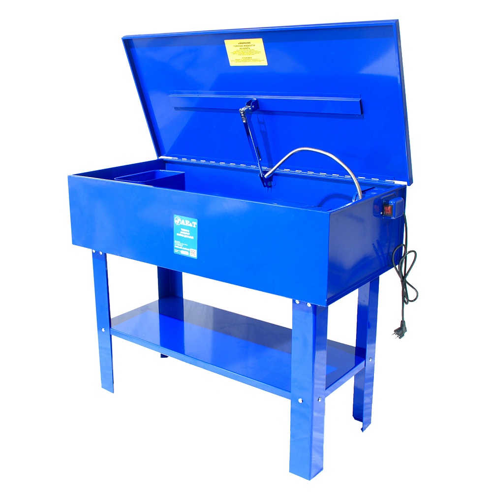 Аппарат мойки деталей T06240-2 AE&T объемом на 150 литров мало чем отличается от аппарата объемом в 75 литров, однако позволяет работать как с маленькими деталями, так и с деталями больших размеров. В связи с большими габаритами, в большей степени данная установка используется в специализированных условиях автосервиса, однако по возможности допускается использование и в частном гараже. Работает установка от электропитания 220 вольт. Аппарат оснащен специальным насосом производительностью от 2.7 до 3.3 литров в минуту, что позволяет очищать запчасти довольно быстро и качественно. Длительность мытья и температурный режим устанавливается с учетом типа изделия и степени его загрязнения, а также условий использования моющего средства.