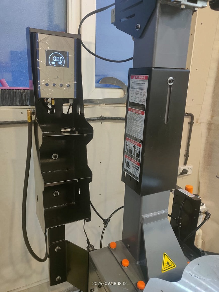 Автоматическое устройство подкачки шин на колонне с шлангом для подкачки шин и цифровым манометром с ЖК дисплеем.