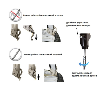 • прижим борта, с автоматическим возвратом в исходное положение по завершению монтажа верхнего борта шины, а также простой вертикальной регулировкой положения исполнительного пневмоцилиндра