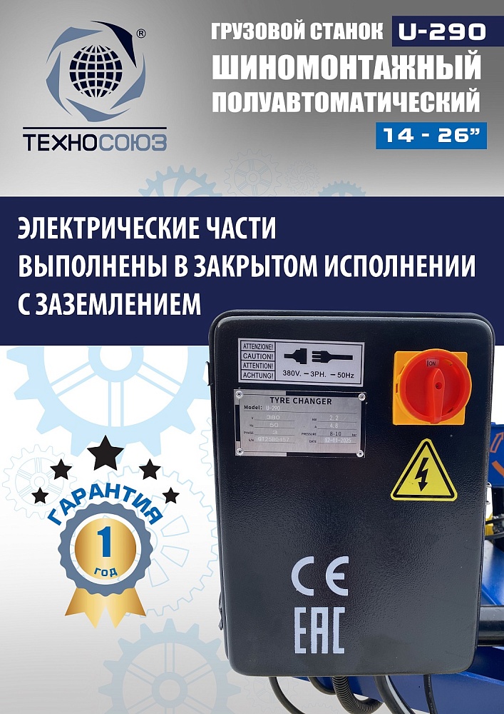 Электрические части грузового шиномонтажного станка выполнены в закрытом исполнении с заземлением.