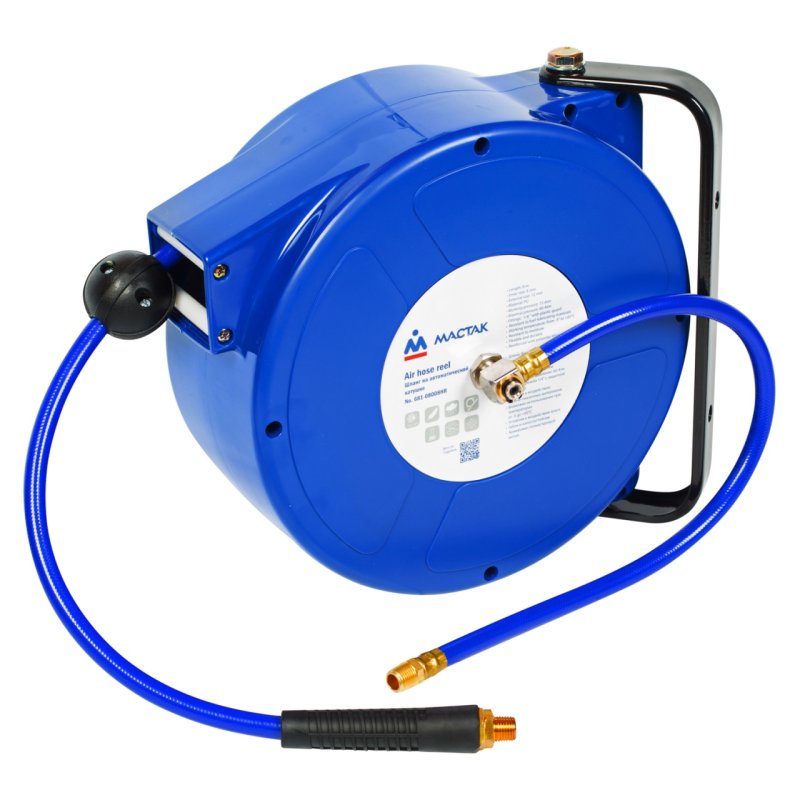 Шланг размещён на автоматической катушке закрытого типа. Конструкция автоматической катушки позволит установить шланг на рабочем месте так, как вам удобно, закрепив его посредством кронштейна на стене, верстаке или другом любом неподвижном предмете, фиксатор пружинного механизма катушки позволит зафиксировать шланг на необходимой длине, а по окончании работы поможет свернуть шланг обратно.