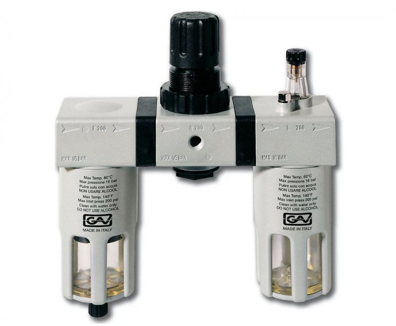 Регулятор давления воздуха с лубрикатором, влагоотделителем и манометром 1/4”. Пропускная способность – 700 л/мин. Давление компрессора