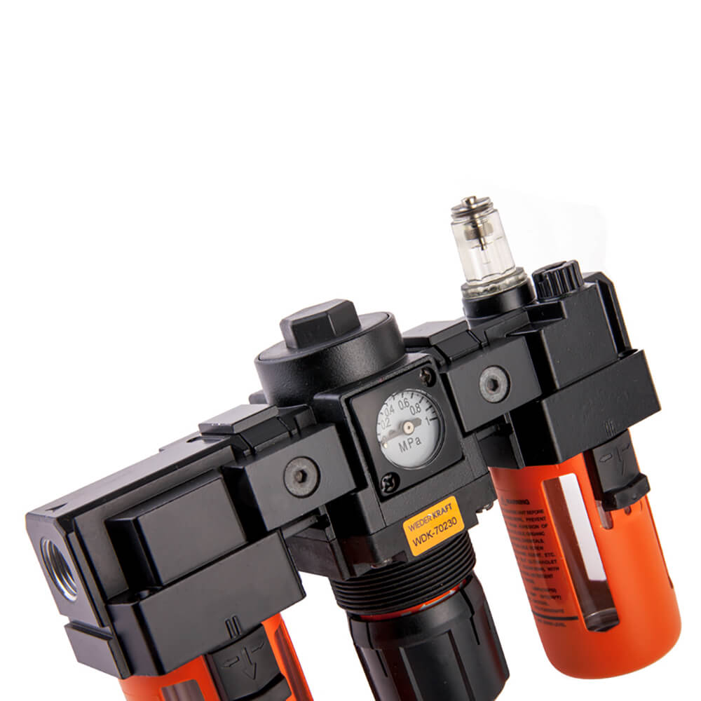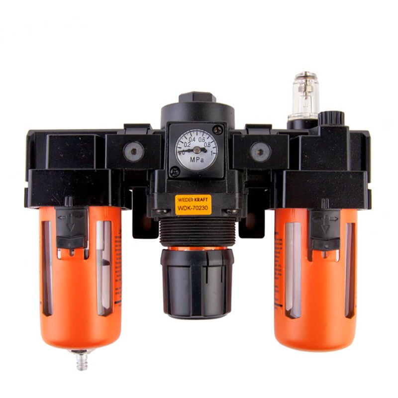 WDK-70230 Блок подготовки воздуха Описание товара WDK-70230 Блок подготовки воздуха Блок подготовки воздуха состоит из влагоотделителя, лубрикатора, регулятора и манометра, двух L-образных скоб-держателей. Резьбовое соединение 3/8″. Незначительное падение давления при производительности до 1500л/мин. Сменный фильтрующий элемент 5мк (опционально 0,01мк, 0,3мк, 1мк, 25мк, 40мк). Рабочая температура -5°С +60°С, рабочее давление до 10 бар.