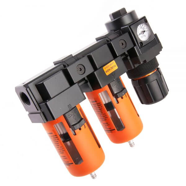 WDK-70730 Блок подготовки воздуха Описание товара WDK-70730 Блок подготовки воздуха состоит из дву масловлагоотделителей, регулятора и манометра, двух L-образных скоб-держателей. Резьбовое соединение 3/8″. Незначительное падение давления при производительности до 1500л/мин. Сменные фильтрующие элементы 5мк и 0,3мк (опционально 0,01мк, 1мк, 25мк, 40мк). Рабочая температура -5°С +60°С, рабочее давление до 10 бар.