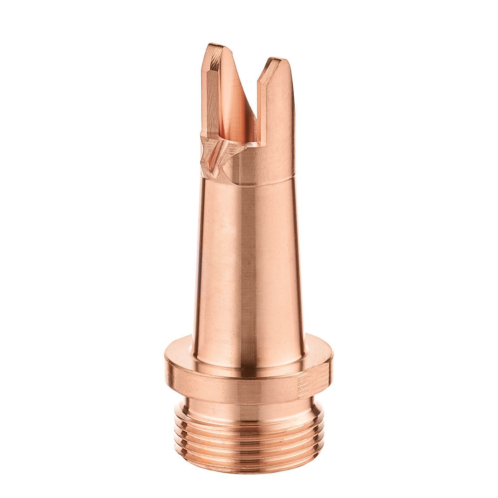 Сопло CS-12 используется для лазерной сварки внешних углов и сварки на плоскости. Сопло используется при сварке металла средних и больших толщин, где необходимо заполнение сварочного шва присадочным материалом. При сварке соплом CS-12 LSR0002 используется проволока диаметром от 0,8 до 1,2 мм. Сопло выполнено из меди, поэтому оно обладает отличными тепловодными свойствами и может выдержать высокие температуры при длительной эксплуатации. Сопло крепится к лазерной головке при помощи резьбы M16. Высота сопла 43 мм.