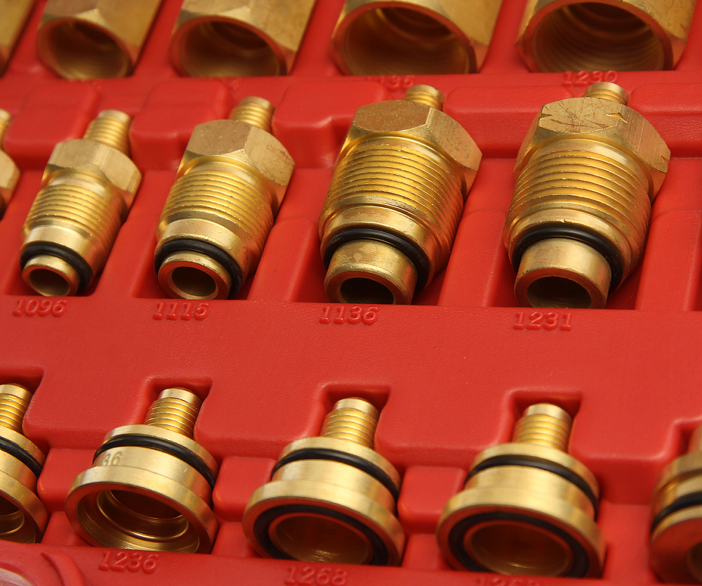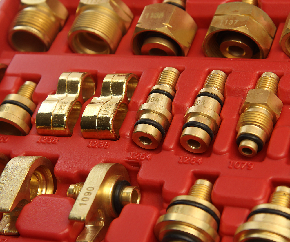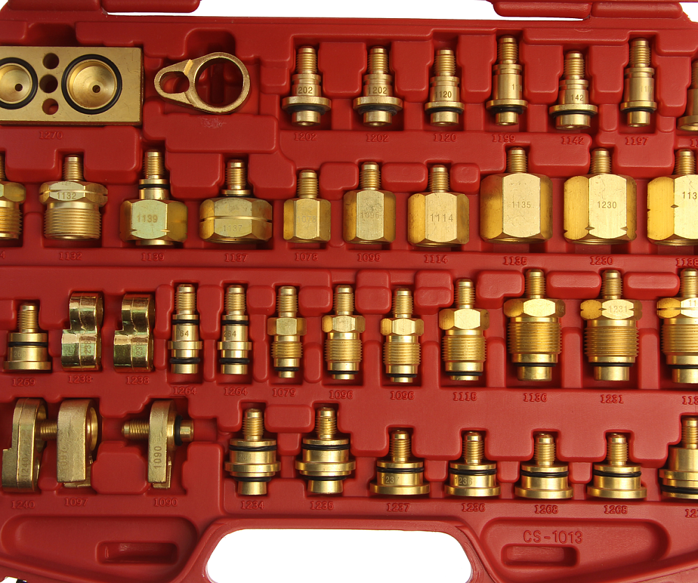 В набор входят различные адаптеры для тестирования системы кондиционирования на предмет утечек.
