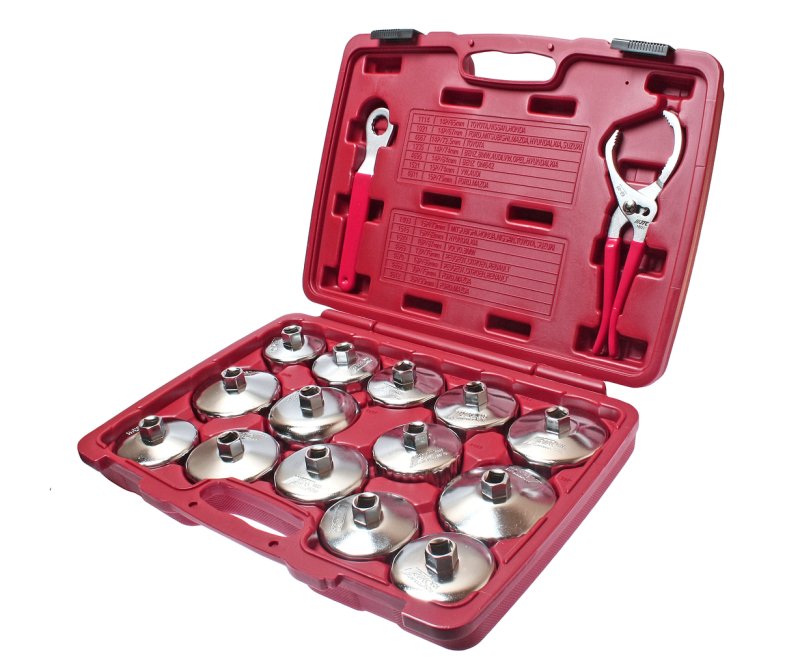 Съемник масляного фильтра "чашка" набор 16 шт. Применяется с инструментом под квадрат 1/2" или ключом 21 мм. Головки изготовлены из стали. В комплекте: