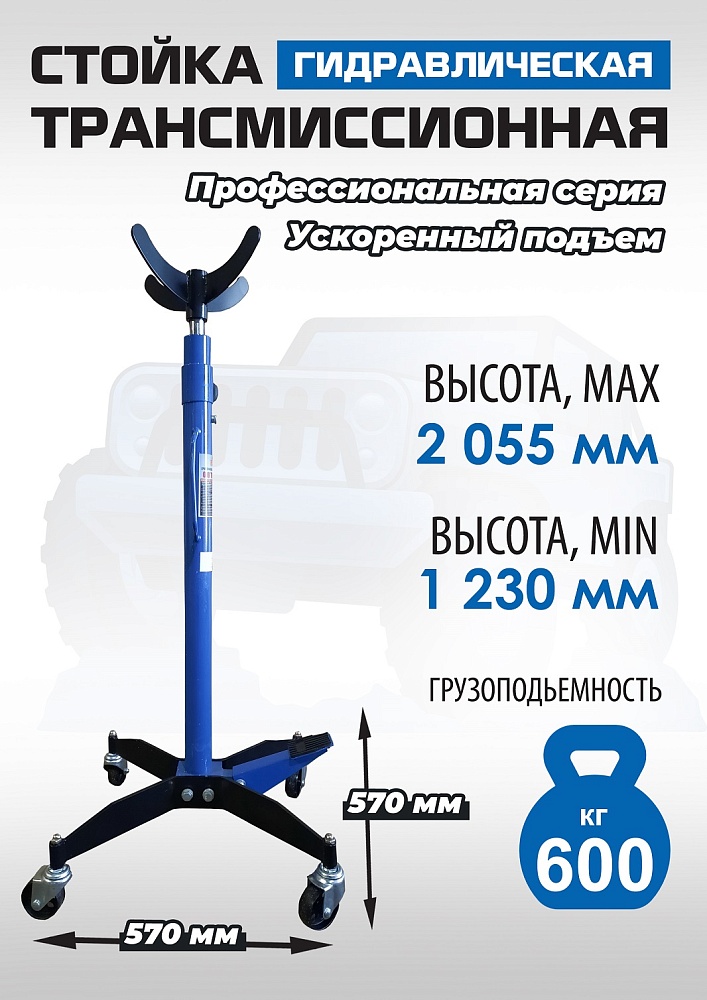 Профессиональная серия. Ускоренный подъём. Мощная педаль. Хромированный шток. Две ручки для перемещения. 4 поворотных колеса с подшипниками обеспечивают легкость перемещения. Для монтажа и демонтажа узлов трансмиссий, тормозных суппортов и других агрегатов автомобиля, или технического обслуживания. Высота подъём = 1230-2055 мм. г/п 600 кг. Стойка трансмиссионная гидравлическая является мобильным подъемным механизмом. <br /><br />  Особенности конструкции ES0905 Стойка трансмиссионная 600 кг:<br /><p></p>·         Система сальников: О – образное кольцо + О – образное уплотнение из PU.<br />·         Увеличенный диаметр штока – 30 мм.<br />·         Мощная педаль подъема трансмиссионной стойки выполнена с резиновой накладкой - не скользит.<br />·         Хромированный шток.<br />·         Оборудована двумя металлическими ручками для удобства транспортировки по цеху.<br />·         Высокая чистота обработки внутренних поверхностей гидравлического цилиндра.<br />·         Оборудована отверстием с заглушкой для заливки масла. гидравлическое масло. Емкость 1,5л.<br />·         Возможность применения сменных адаптеров.<br />·         4 металлических колеса стойки выполнены из металла, а не из пластика, что значительно увеличивает срок эксплуатации.<br />·         Цилиндр с клапанным блоком и возвратной пружиной<br /><br /><p><br />Уважаемые клиенты, несколько рекомендаций: </p><p> Во избежание поломки, при использовании стойки вместе с подъемником просим учесть - не пытайтесь опустить автомобиль на гидравлическую стойку. Грузоподъемность стойки рассчитана на подъем и удержание агрегата(КПП, редуктора, суппорта и т.п.), а не автомобиля! Не используйте стойку в качестве страховочной при ремонте автомобилей с длинной базой(для избежания раскачки автомобиля и т.п.). Выдавит манжеты из-за превышения нагрузки. Используемое масло – гидравлическое типа И-20А или аналог. При использовании стойки на улице в зимний период, просим учитывать температуру замерзания смазки. Стойка может сломаться из-за изменения консистенции смазочного материала.</p>
