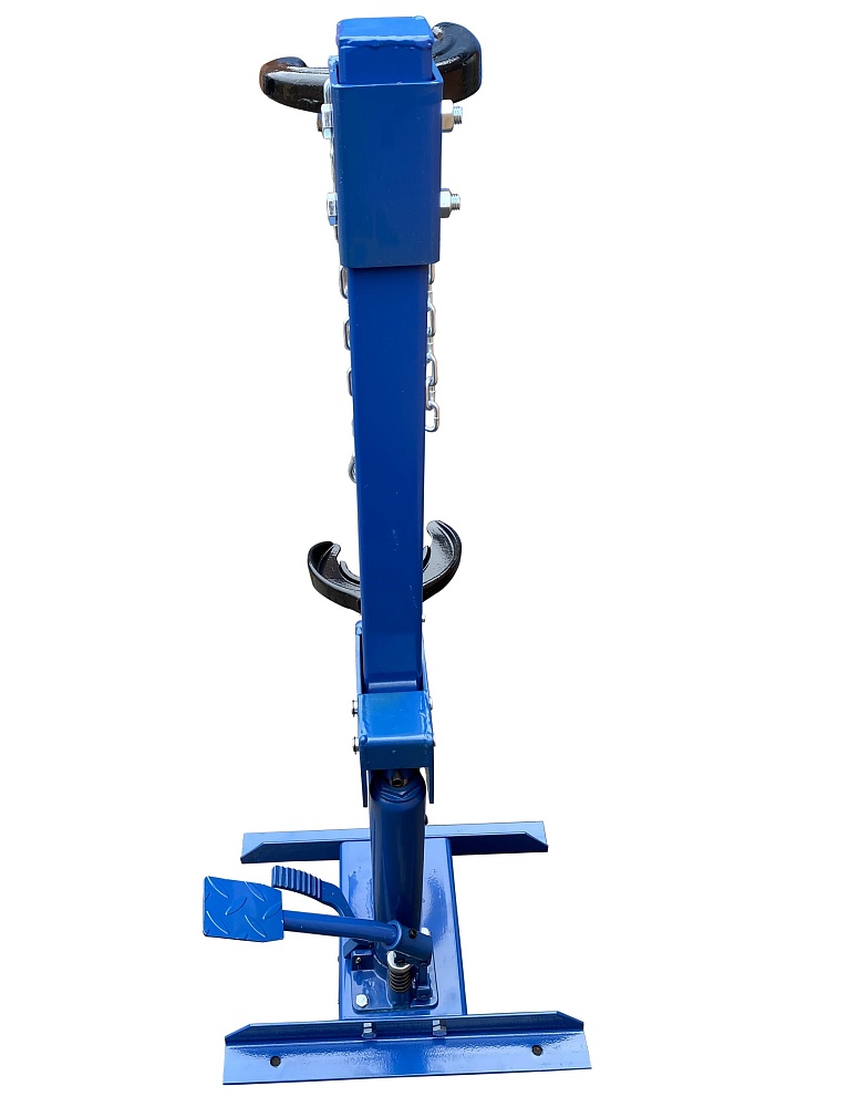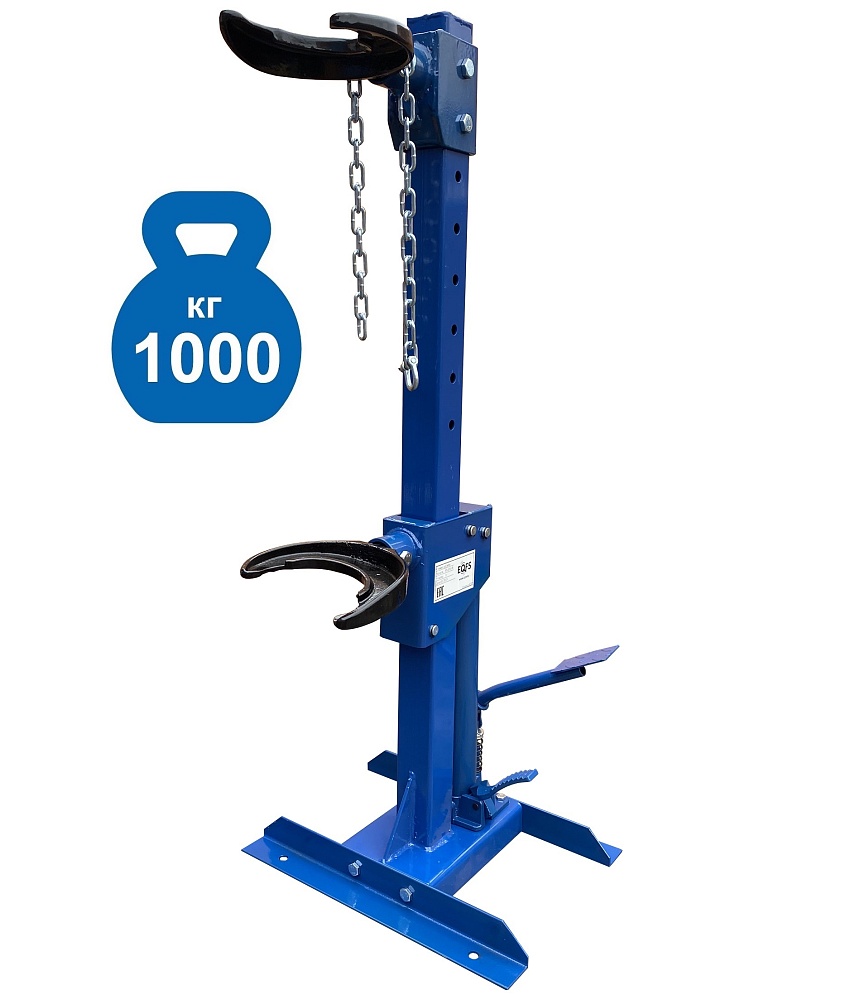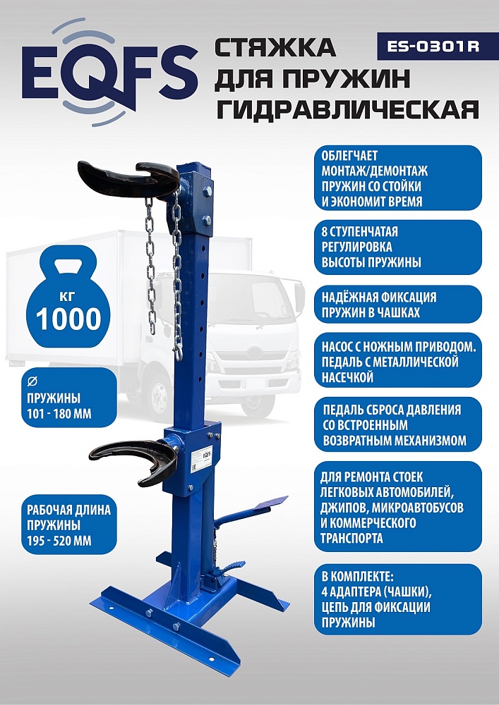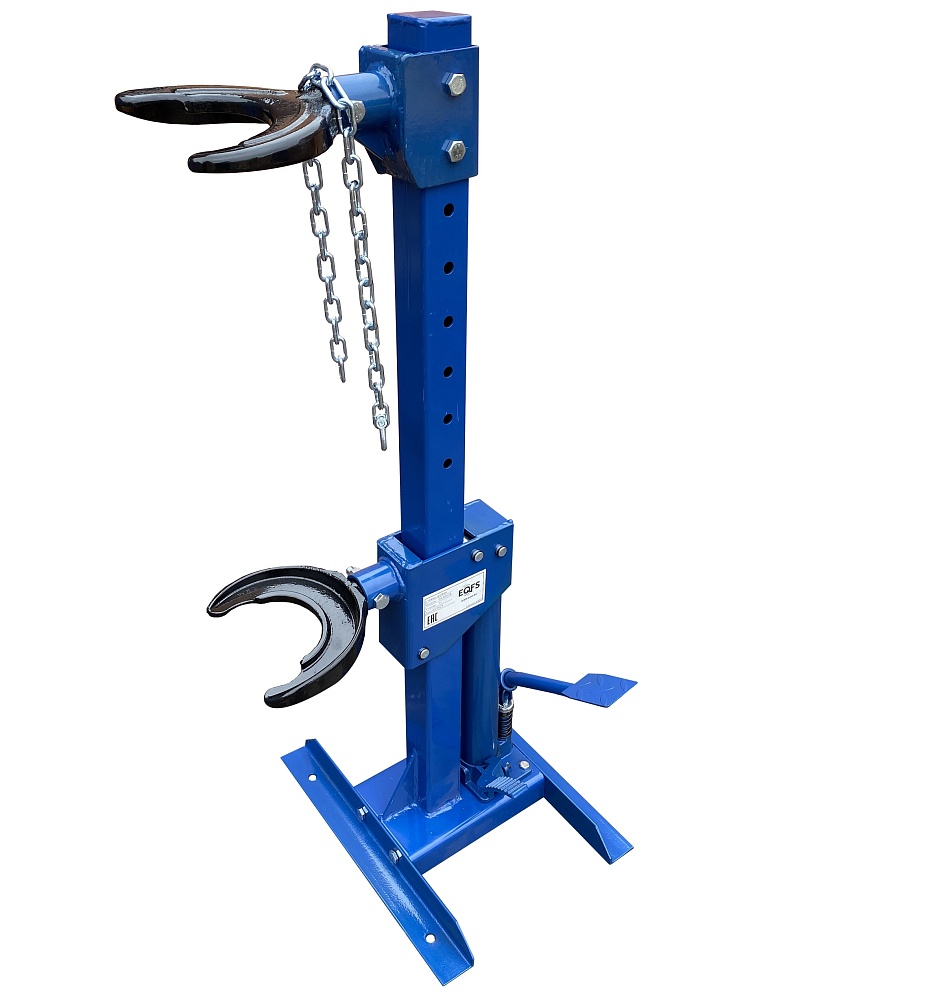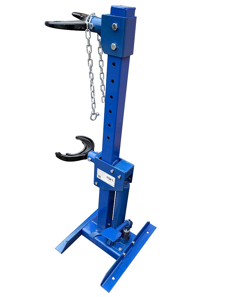 Профессиональная. Напольная с ножным приводом. Экономит время. Облегчает монтаж / демонтаж особо прочных пружин со стойки. Для работы со стойками легковых автомобилей, джипов, микроавтобусов и коммерческого автотранспорта. 8 Ступенчатая регулировка (регулируется по длине пружины). С гидравлическим цилиндром усилием 1000 кг. Ход поршня 325 мм. Диаметр пружины 101 - 180 мм.  Рабочая длина min-max 195-520 мм. В комплекте 4 адаптера чашки + цепь для фиксации пружины. Цвет темно-синий.