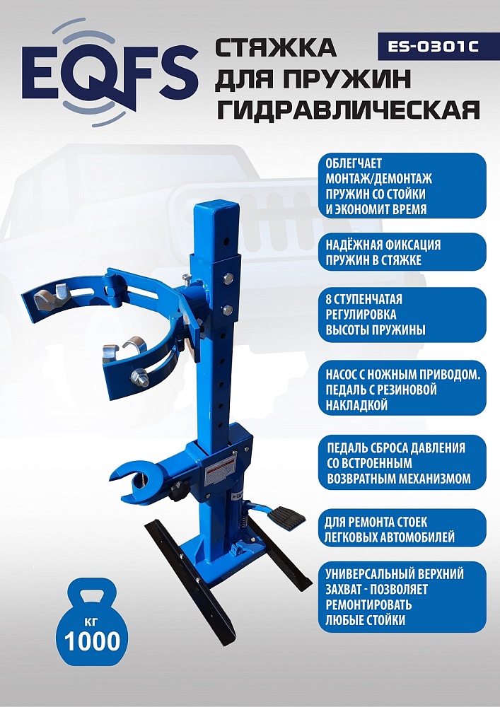 Стяжка для пружин профессиональная с гидравлическим цилиндром усилием 1000 кг . Ход поршня 220 мм. Диаметр пружины 125-165 мм. Ножной привод подъема и опускания. Предназначена для стяжки пружин легковых автомобилей. Цвет темно-синий.