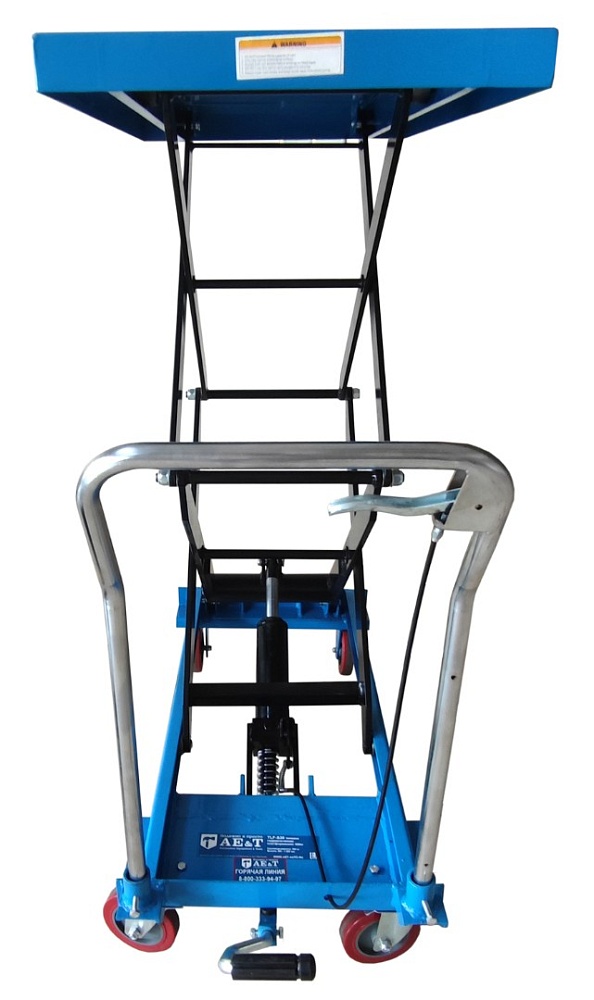 Оборудование прочное, изготовлено из качественных долговечных материалов, имеет красивый внешний вид и отличается простотой в эксплуатации. Подъем грузовой платформы осуществляется нажатием на педаль. Опускание регулируется рукояткой.