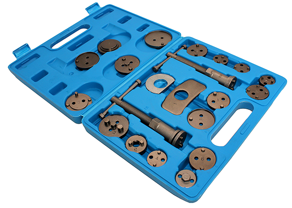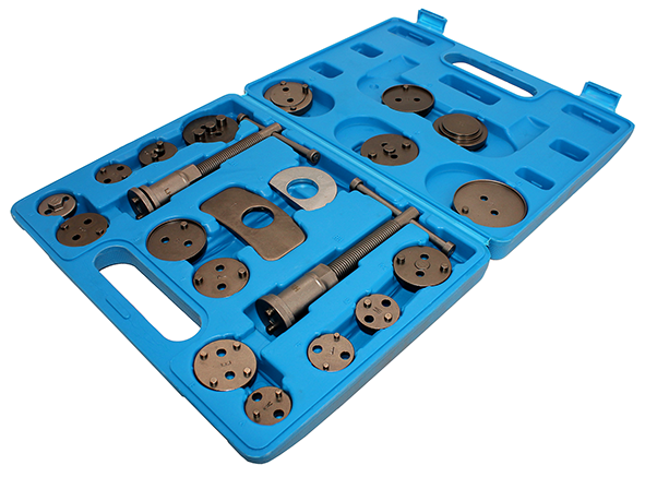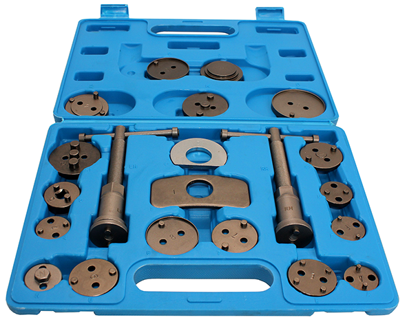 Инструмент сведения тормозных цилиндров 21шт - комплект универсальных приспособлений для утапливания поршней тормозных цилиндров с правосторонней и левосторонней резьбой. Данный набор подходит для обслуживания большинства легковых автомобилей.
