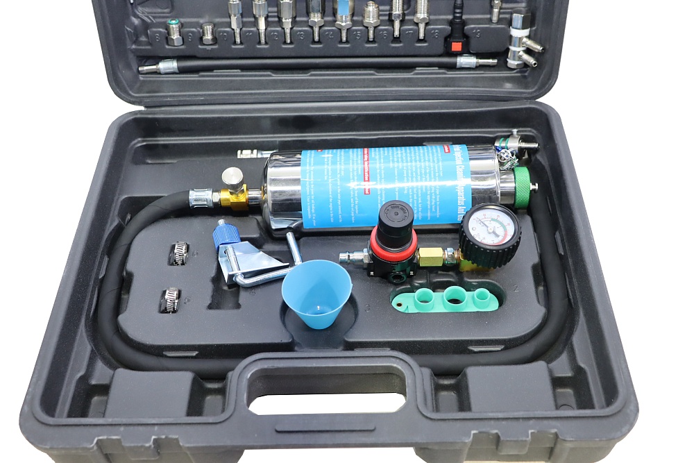 Комплект инструментов, приспособлей и адаптеров Kraftwell KRW-FSF для тестирования и промывки топливной системы дизельных и бензиновых автомобилей без демонтажа.